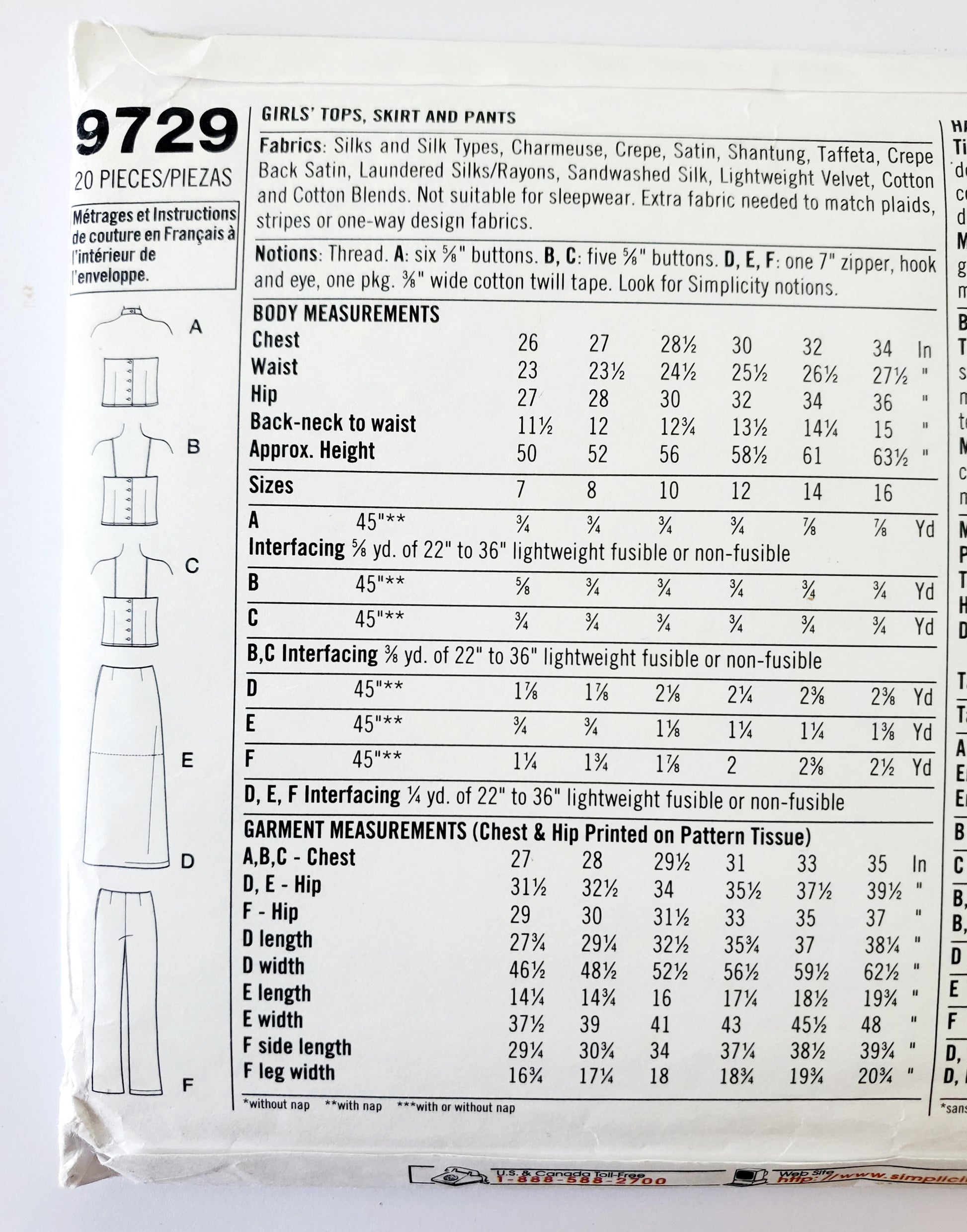 Notions: Thread. A: six ⅝" buttons. B, C: five ¾" buttons. D, E, F: one 7" zipper, hook and eye, one pkg. ⅜" wide cotton twill tape. Look for Simplicity notions.