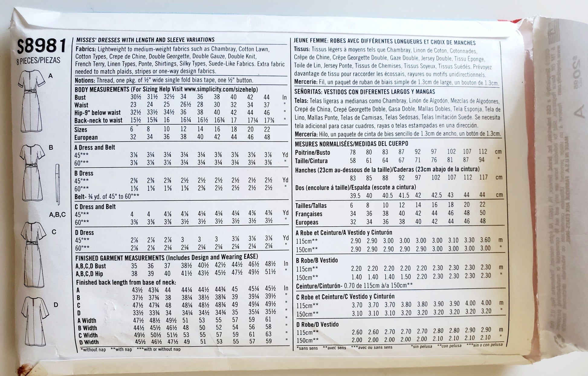 SIMPLICITY Sewing Pattern S8981, Dress, Fabric Belt, Size 6-14