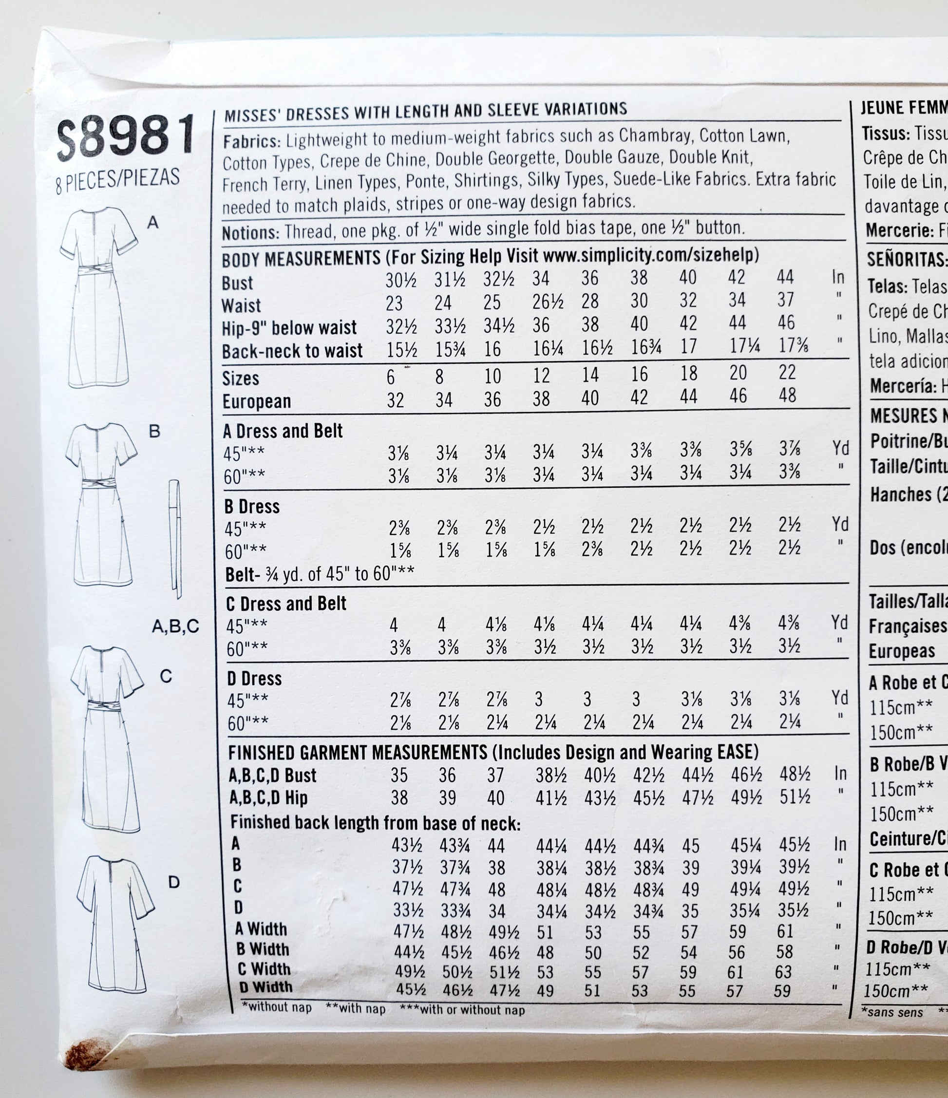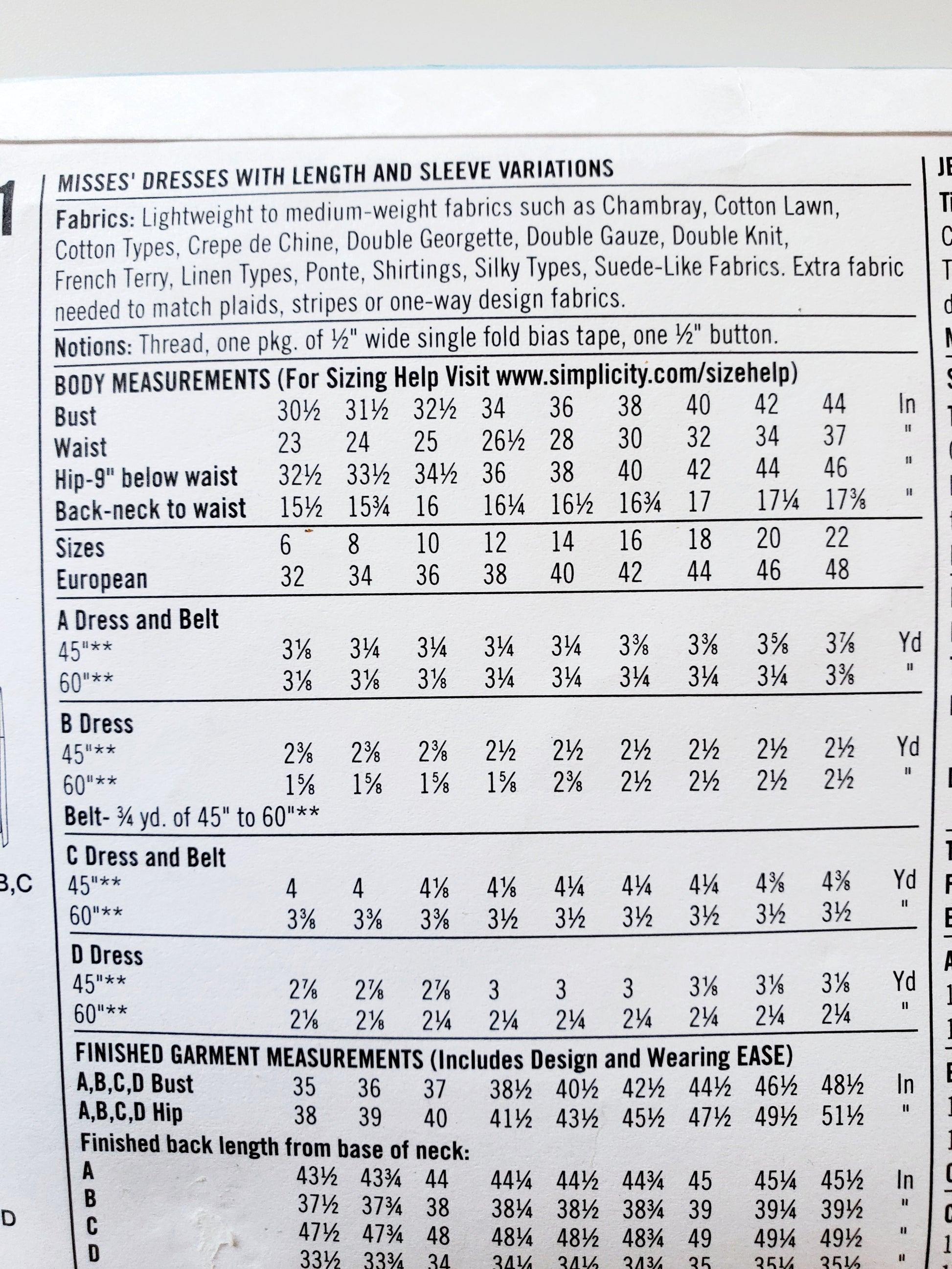 Fabrics: Lightweight to medium-weight fabrics such as Chambray, Cotton Lawn, Cotton Types, Crepe de Chine, Double Georgette, Double Gauze, Double Knit, French Terry, Linen Types, Ponte, Shirtings, Silky Types, Suede-Like Fabrics. Extra fabric needed to match plaids, stripes or one-way design fabrics.