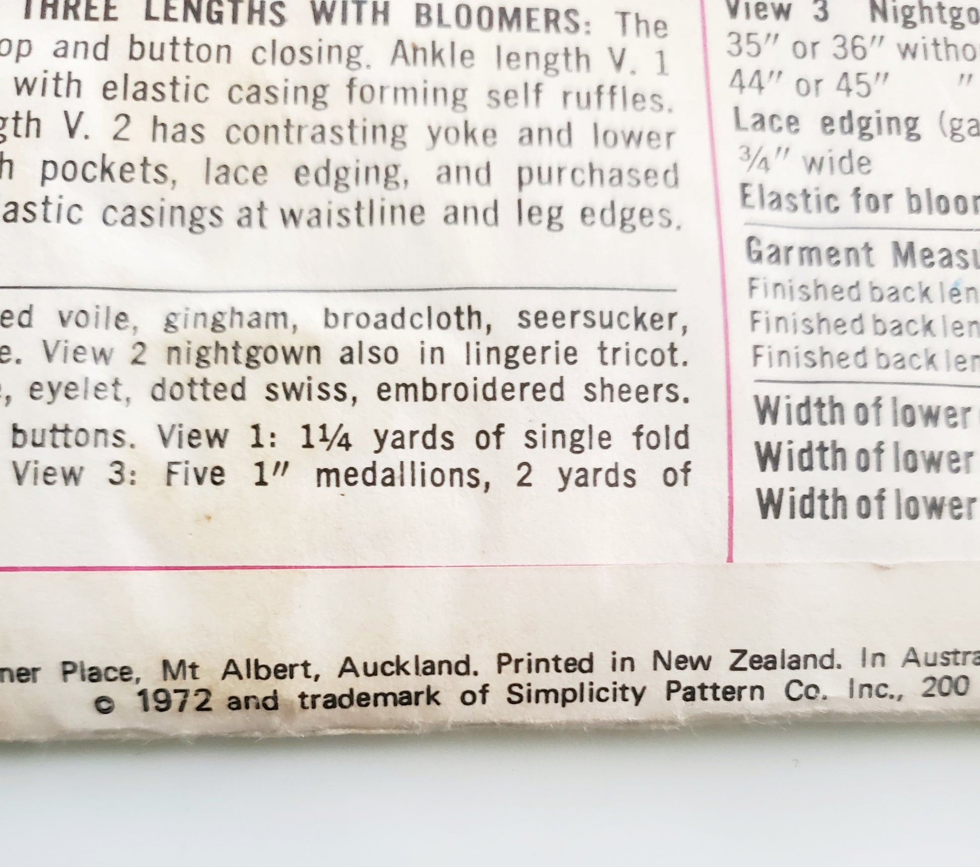 MISSES' AND WOMEN'S NIGHTGOWN IN THREE LENGTHS WITH BLOOMERS: The nightgown gathered to yoke has back loop and button closing. Ankle length V. 1 with lace edging has long raglan sleeves with elastic casing forming self ruffles. V. 2 & 3 are sleeveless. Above knee length V. 2 has contrasting yoke and lower band. Shortie nightgown V. 3 with patch pockets, lace edging, and purchased medallions has matching bloomers with elastic casings at waistline and leg edges. Leg casings form self ruffles.