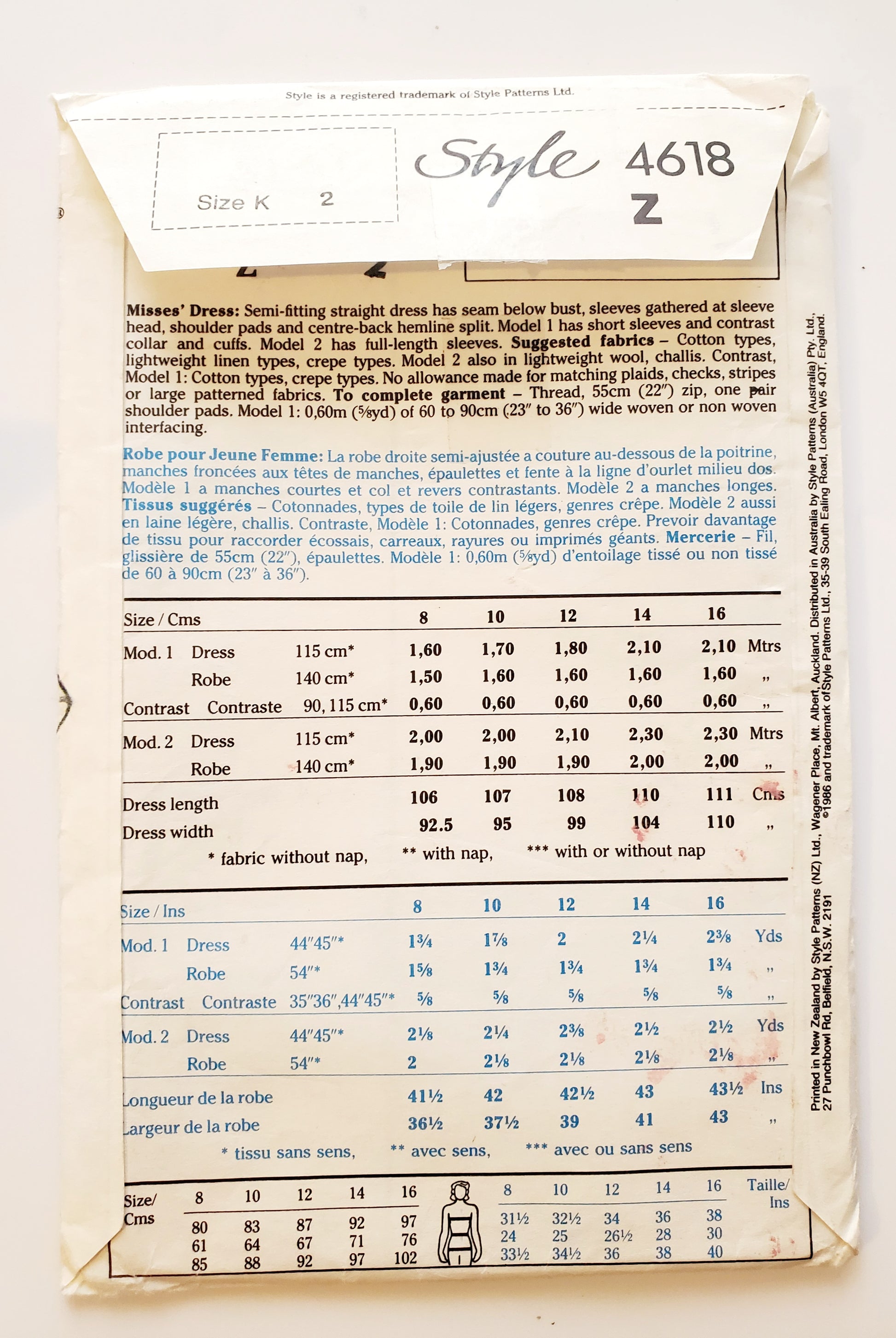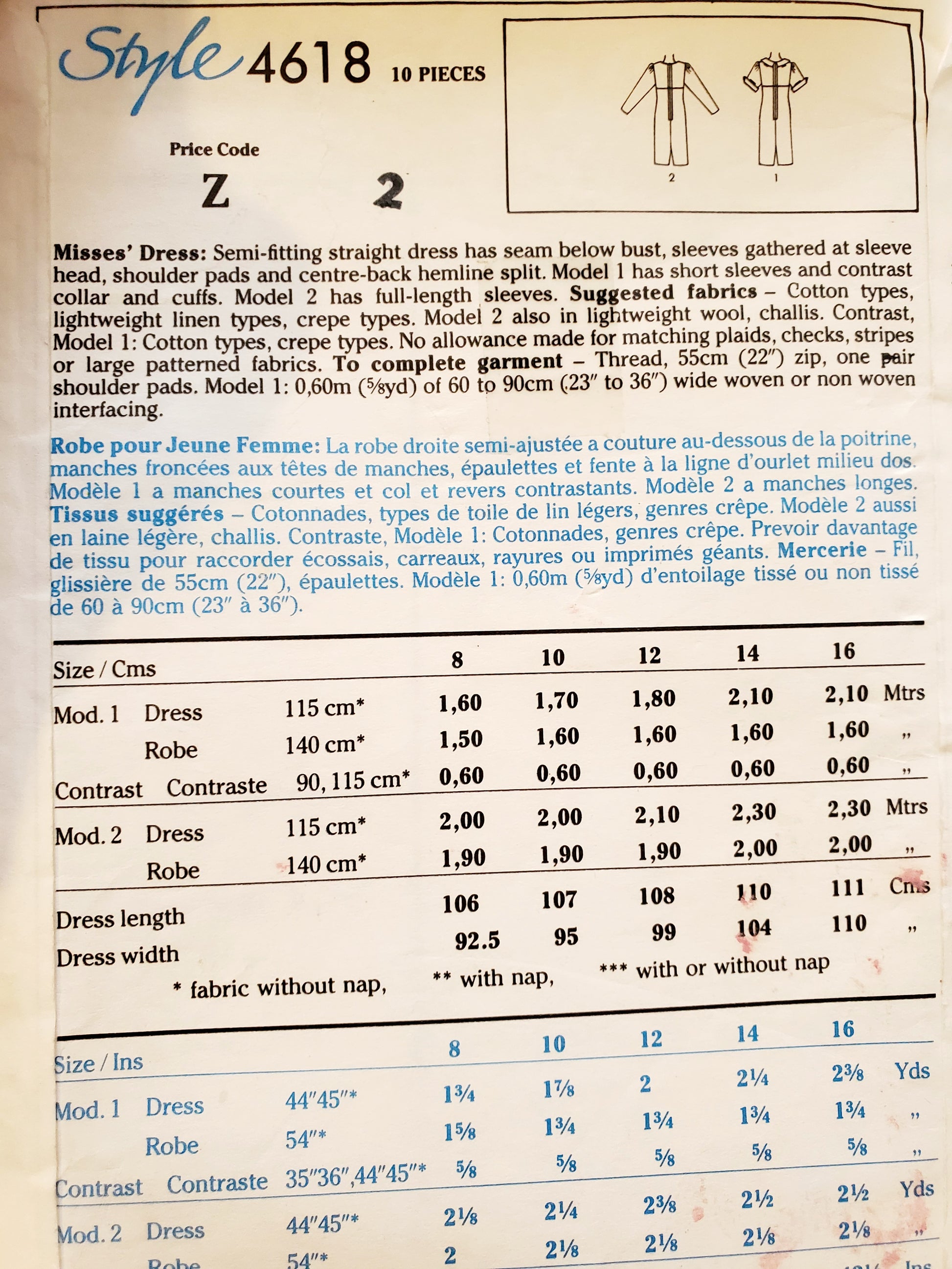 Suggested fabrics – Cotton types, lightweight linen types, crepe types. Model 2 also in lightweight wool, challis. Contrast, Model 1: Cotton types, crepe types. No allowance made for matching plaids, checks, stripes or large patterned fabrics. To complete garment – Thread, 55cm (22") zip, one pair shoulder pads. Model 1: 0.65m (5/8yd) of 60 to 90cm (23" to 36") wide woven or non woven interfacing.