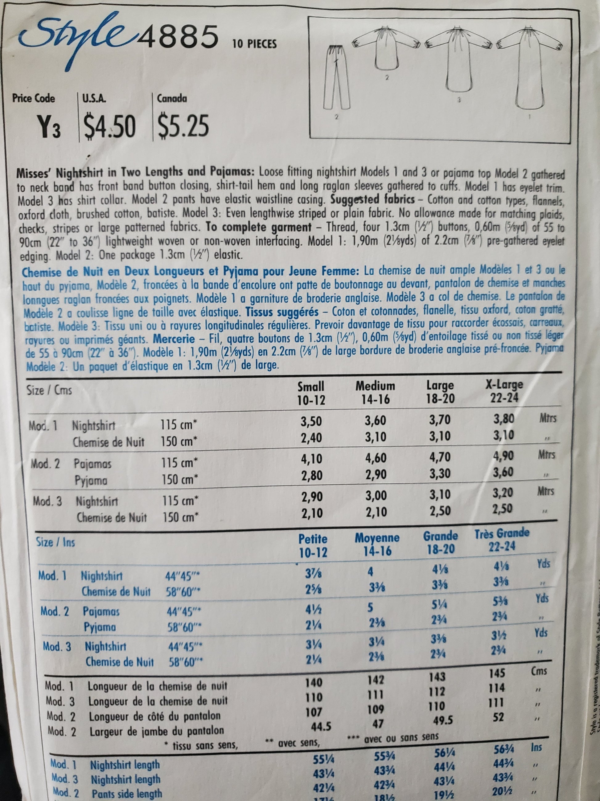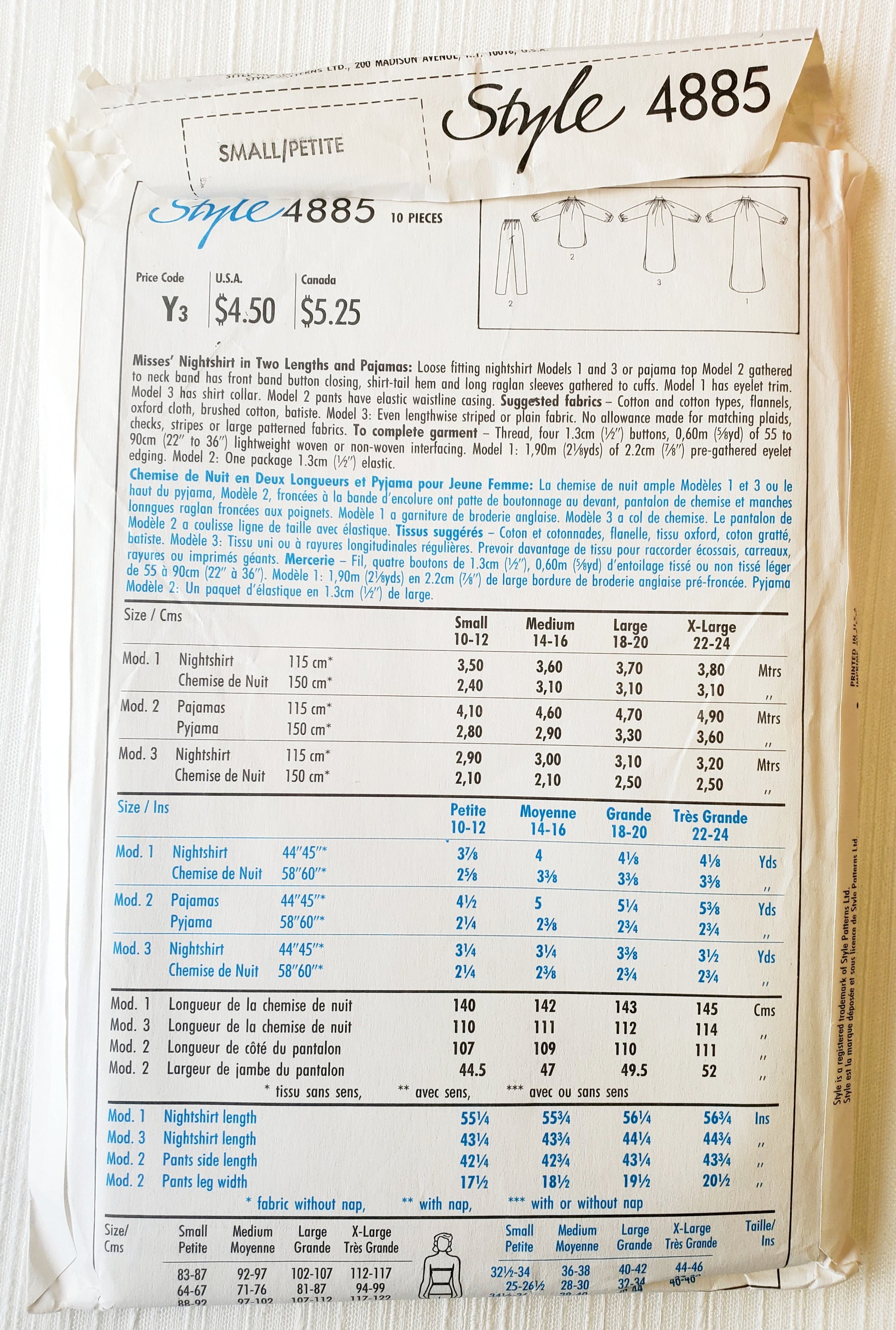 Misses' Nightshirt in Two Lengths and Pajamas: Loose fitting nightshirt Models 1 and 3 or pajama top Model 2 gathered to neck band has front band button closing, shirt-tail hem and long raglan sleeves gathered to cuffs. Model 1 has eyelet trim. Model 3 has shirt collar. Model 2 pants have elastic waistline casing.