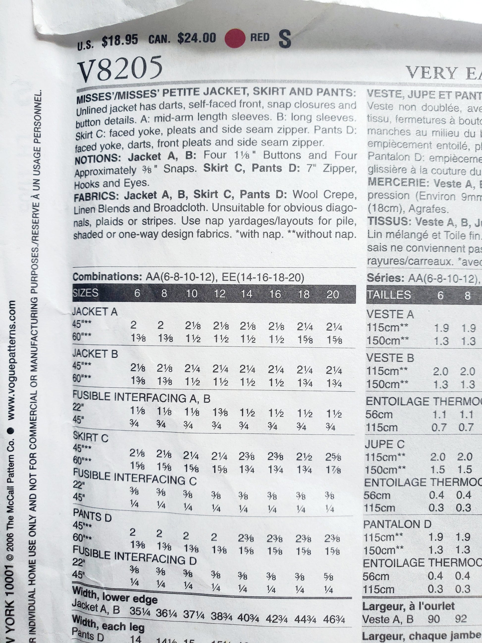 VERY EASY VOGUE Sewing Pattern V8205, Unlined Jacket, Skirt, Pants, Size 14-20