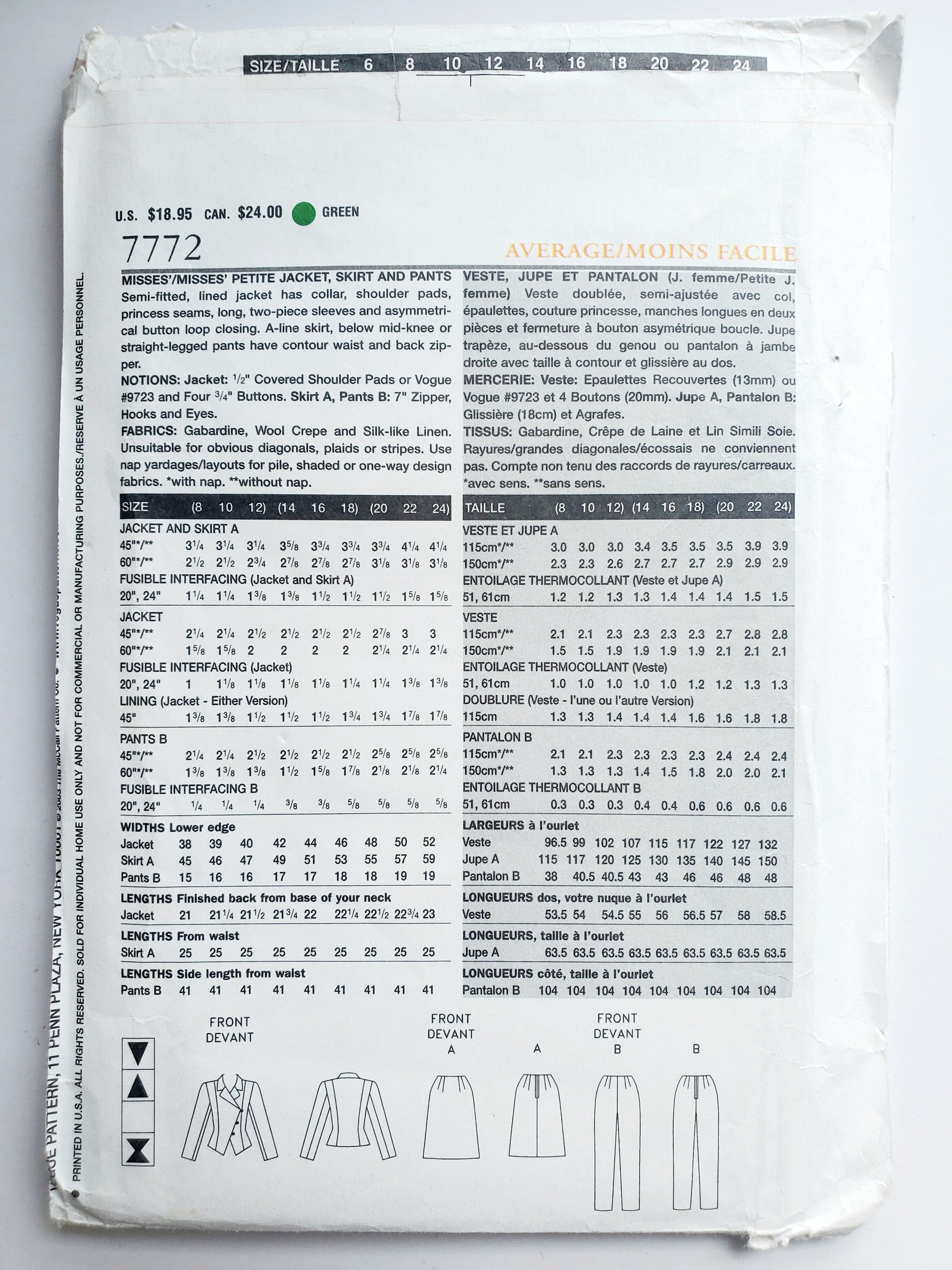 FABRICS: Gabardine, Wool Crepe, Silk-like Linen. Unsuitable for obvious diagonals, plaids or stripes. Use nap yardages/layouts for pile, shaded or one-way design fabrics. *With nap. **Without nap.