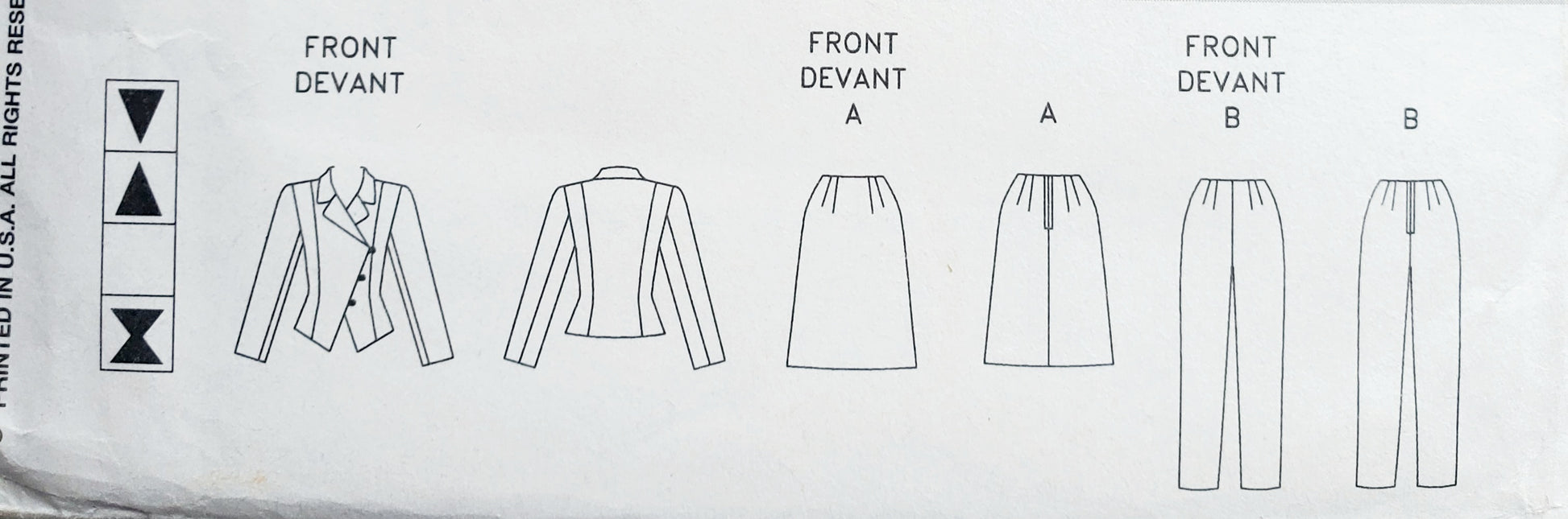 NOTIONS: Jacket: ½" Covered Shoulder Pads or Vogue #9723 and Four ¾" Buttons. Skirt A, Pants B: 7" Zipper, Hooks and Eyes.