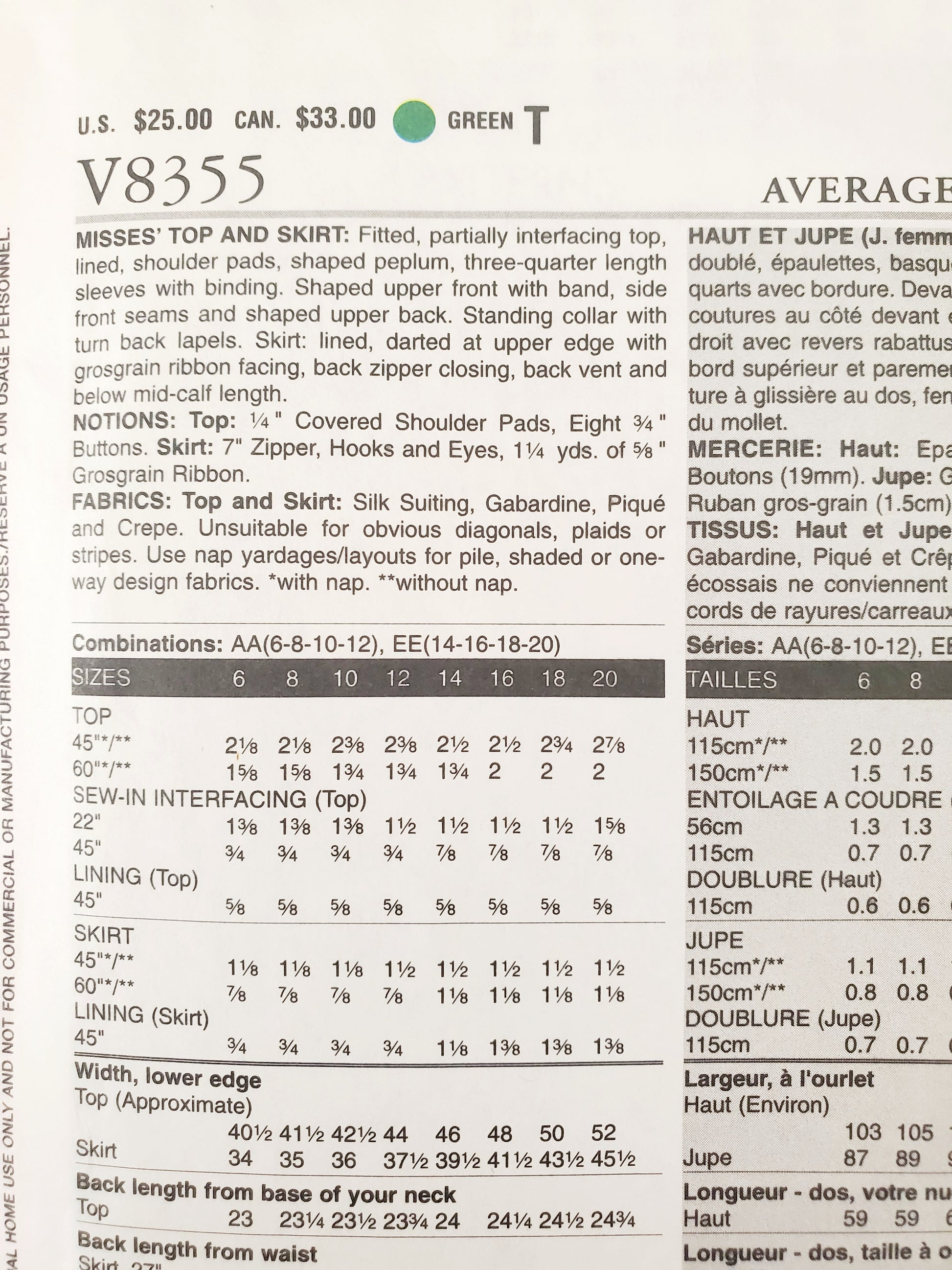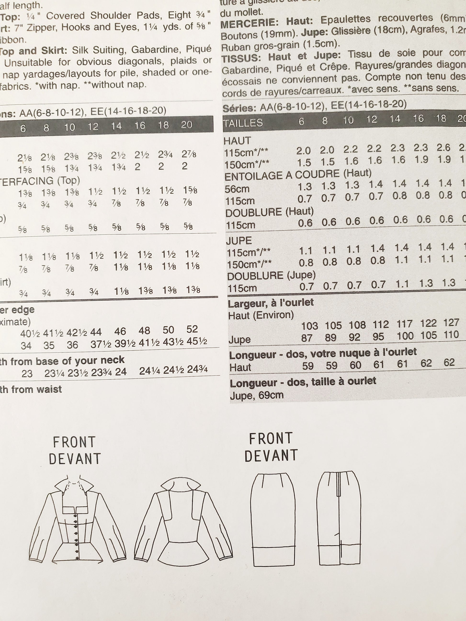 FABRICS: Top and Skirt: Silk Suiting, Gabardine, Piqué and Crepe. Unsuitable for obvious diagonals, plaids or stripes. Use nap yardages/layouts for pile, shaded or one-way design fabrics. *with nap. **without nap.