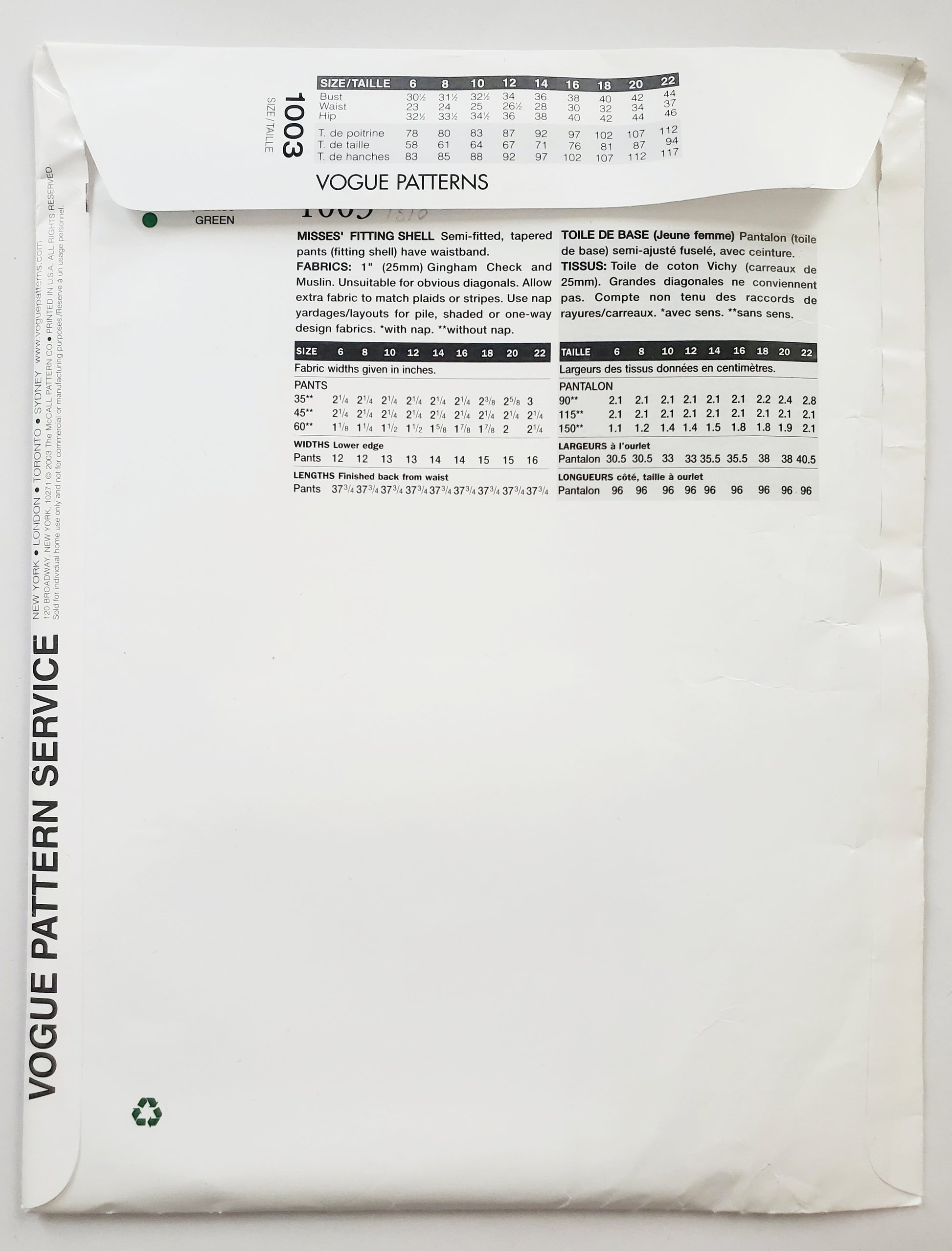 VOGUE Sewing Pattern 1003 Misses Fitting Shell for Tapered Pants Size 12