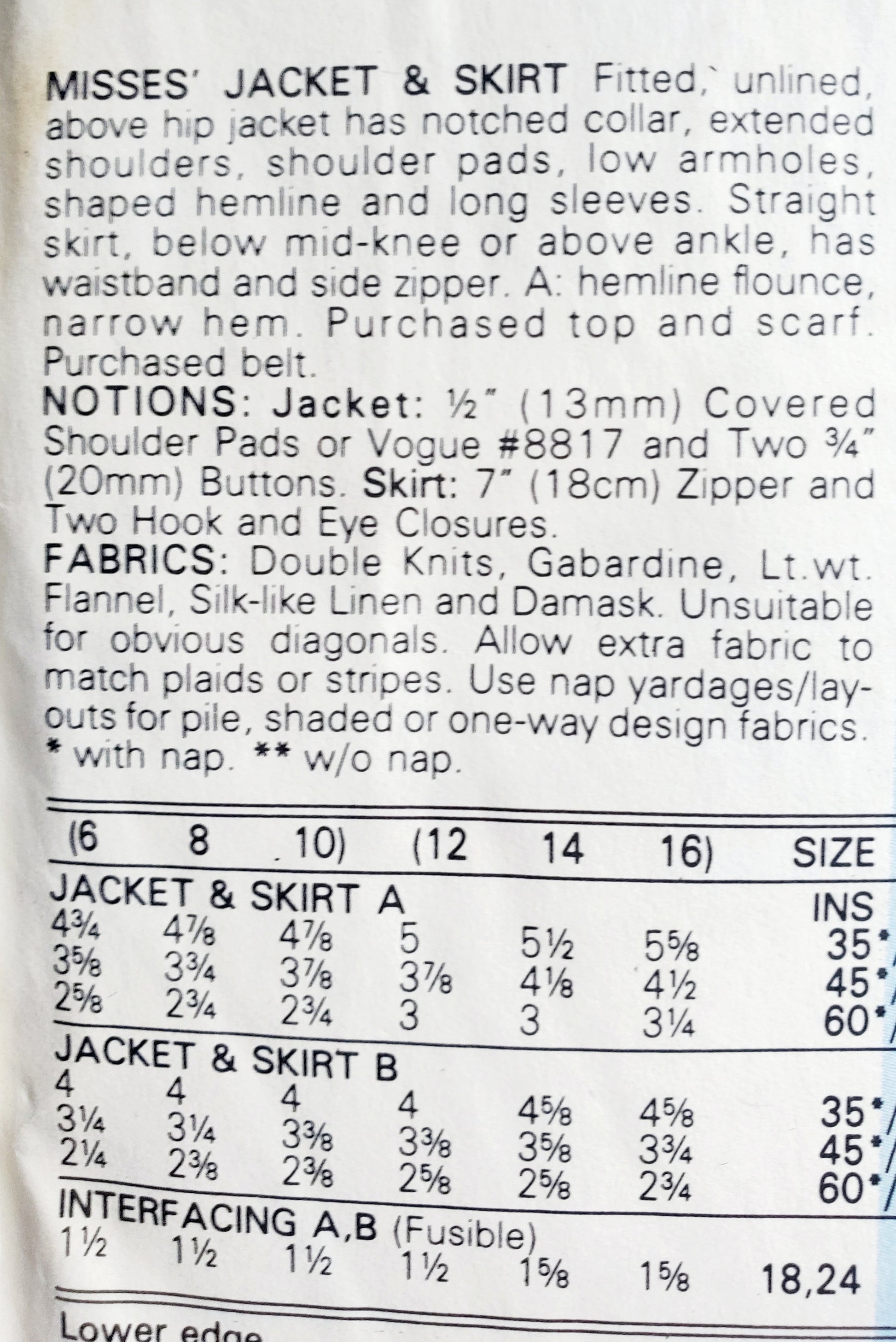 NOTIONS: Jacket: ½" (13mm) Covered Shoulder Pads or Vogue #8817 and Two ¾" (20mm) Buttons. Skirt: 7" (18cm) Zipper and Two Hook and Eye Closures.