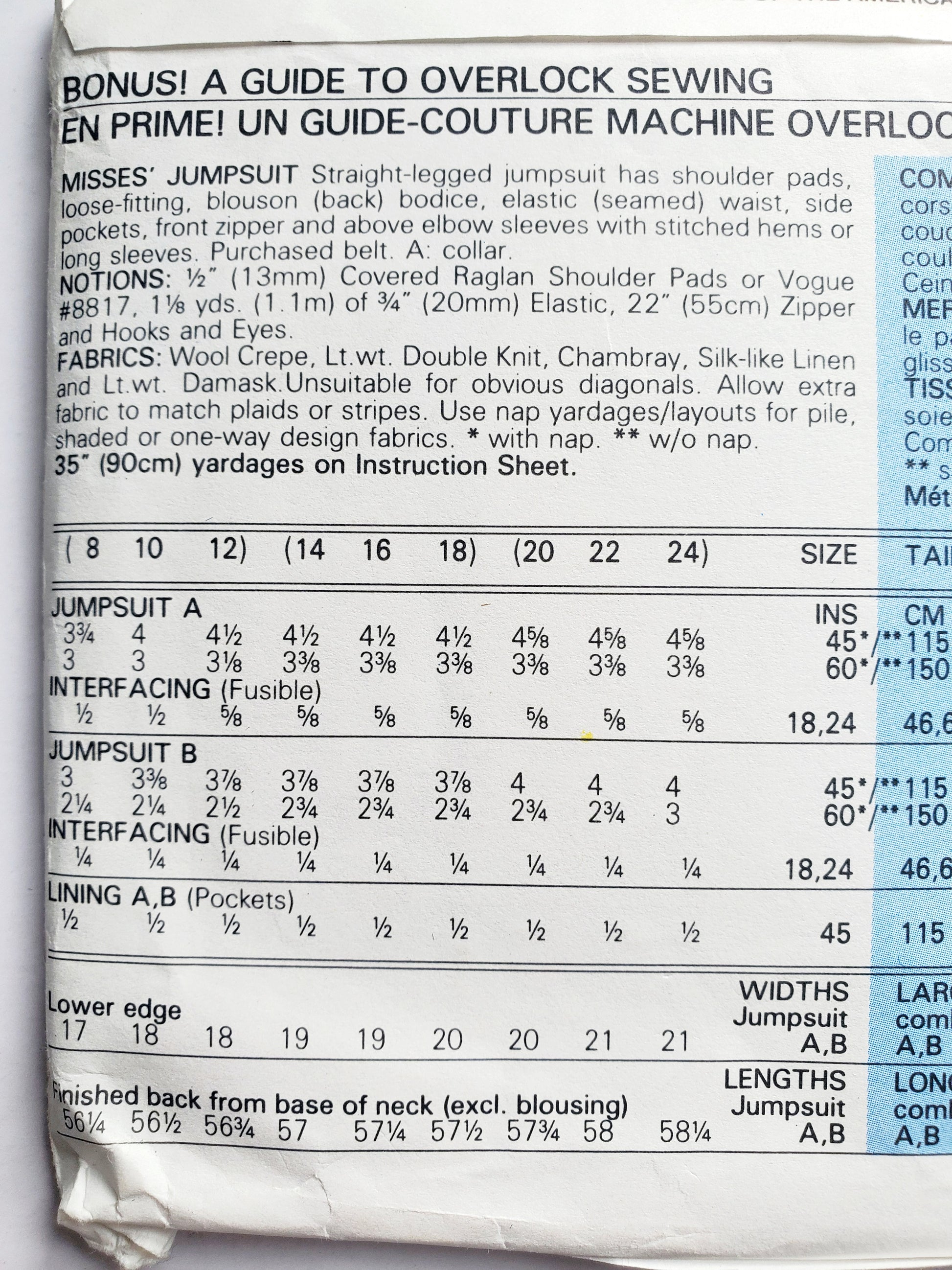FABRICS: Wool Crepe, Lt.wt. Double Knit, Chambray, Silk-like Linen and Lt.wt. Damask. Unsuitable for obvious diagonals. Allow extra fabric to match plaids or stripes. Use nap yardages/layouts for pile, shaded or one-way design fabrics. * with nap. ** w/o nap.