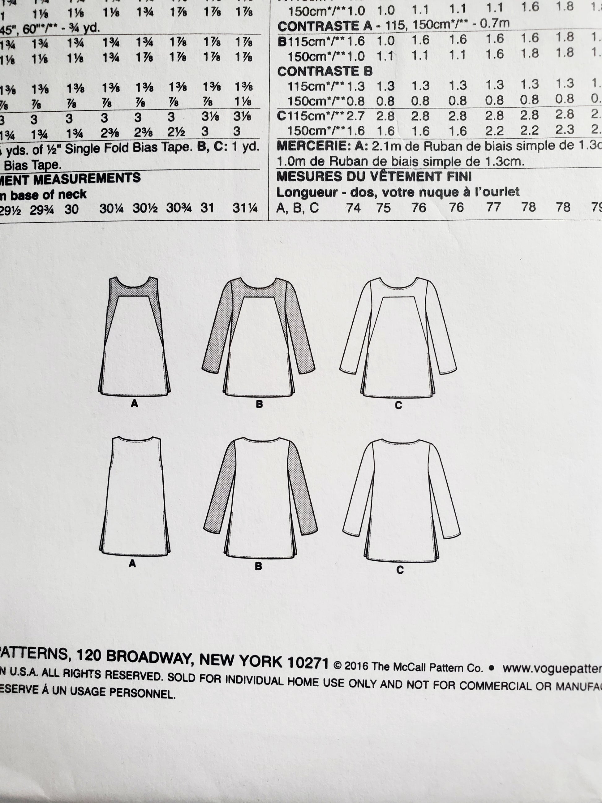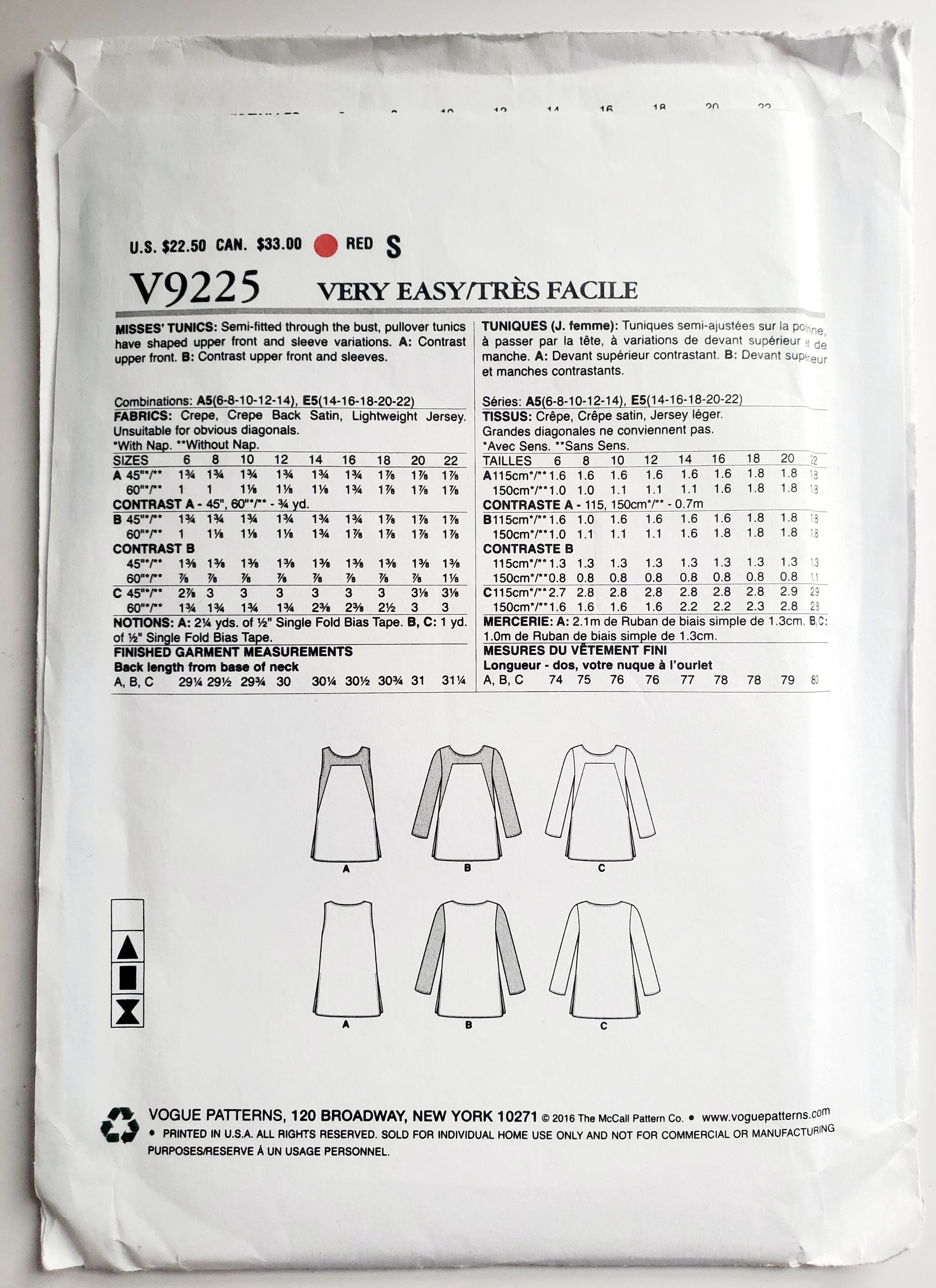 VERY EASY VOGUE Sewing Pattern V9225, Semi-Fitted Tunics, Shaped Tunics, Size 6-14