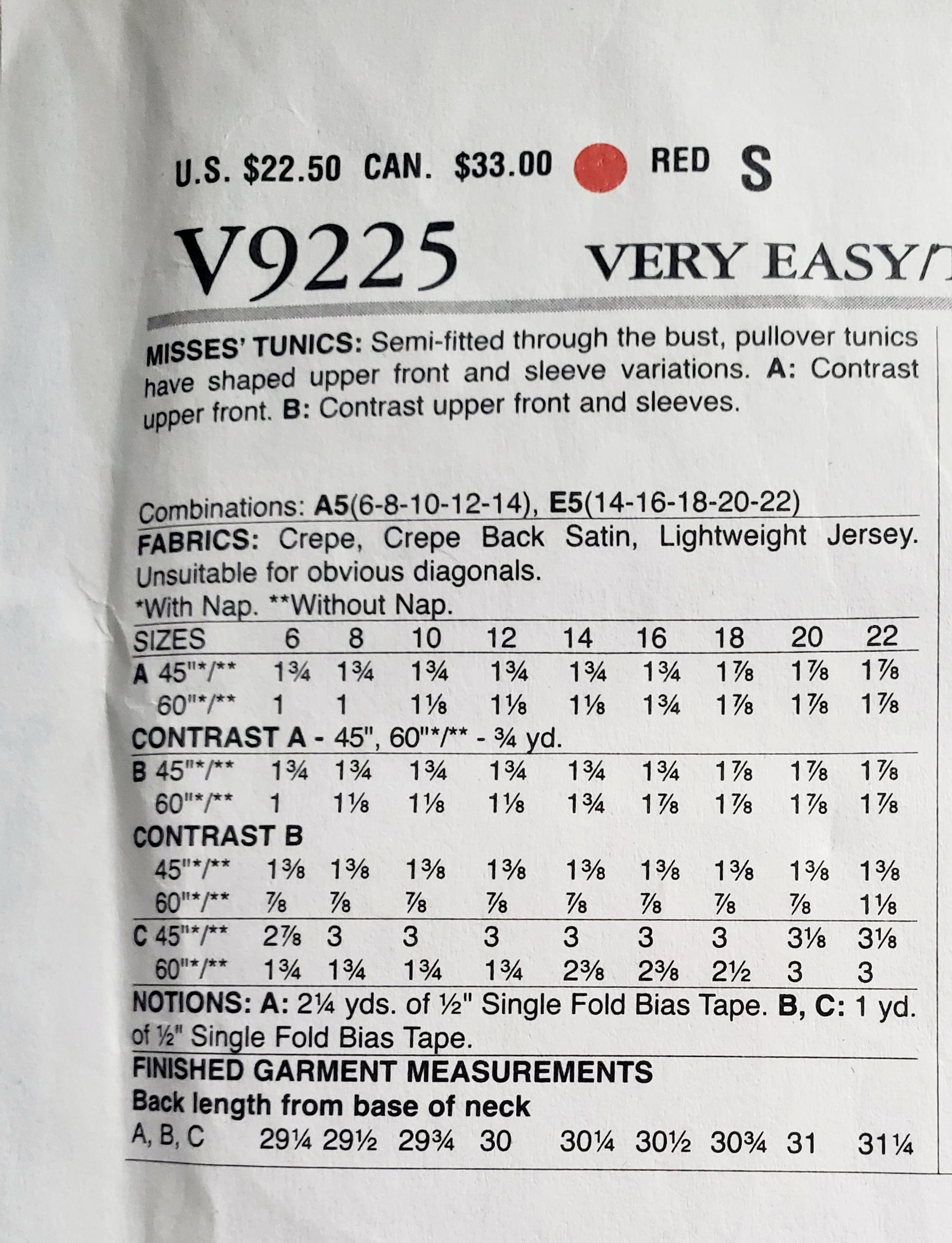 VERY EASY VOGUE Sewing Pattern V9225, Semi-Fitted Tunics, Shaped Tunics, Size 14-22