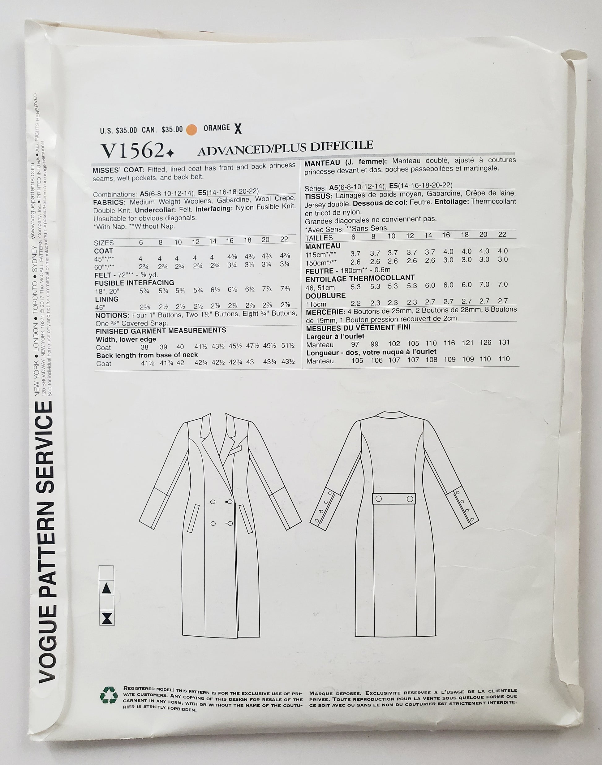 VOGUE PATTERNS, Sewing Pattern V1562, LIALIA BY JULIA ALARCON, DESIGNER ORIGINAL, Coat, Fitted Coat, Lined Coat, Size 6-14