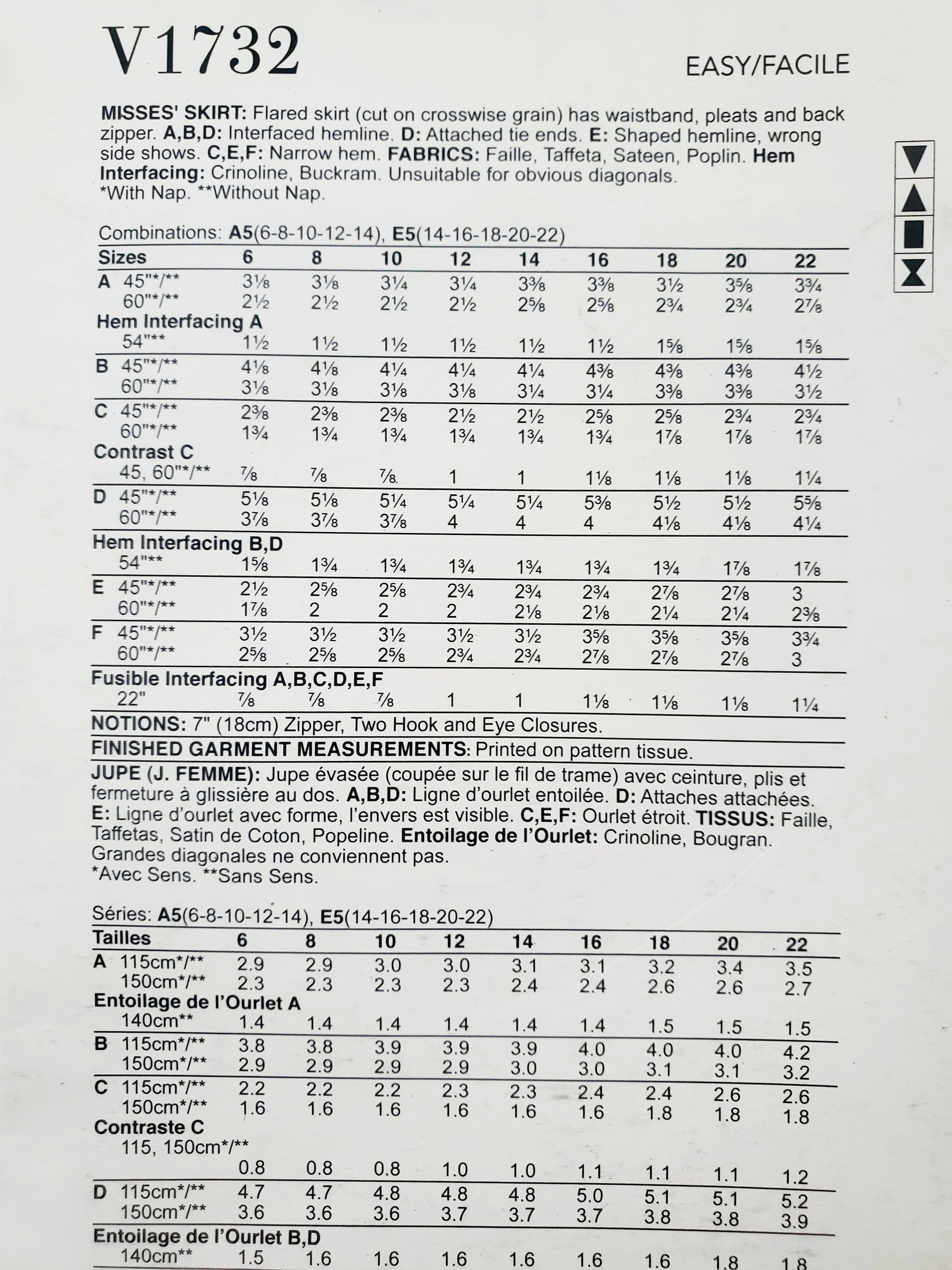 VOGUE PATTERNS, Sewing Pattern V1732, Skirt, Flared Skirt, Pleats, Wide Waistband, Size 14-22