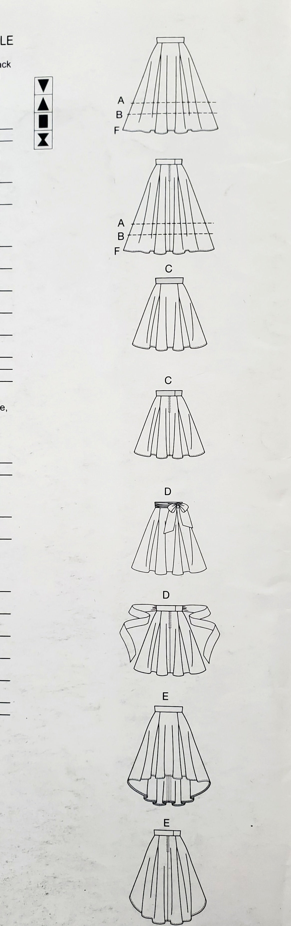 MISSES' SKIRT: Flared skirt is cut on crosswise grain, has waistband, pleats and back zipper. A, B, D: Interfaced hemline. D: Attached tie ends. E: Shaped hemline, wrong side shows. C, E, F: Narrow hem.