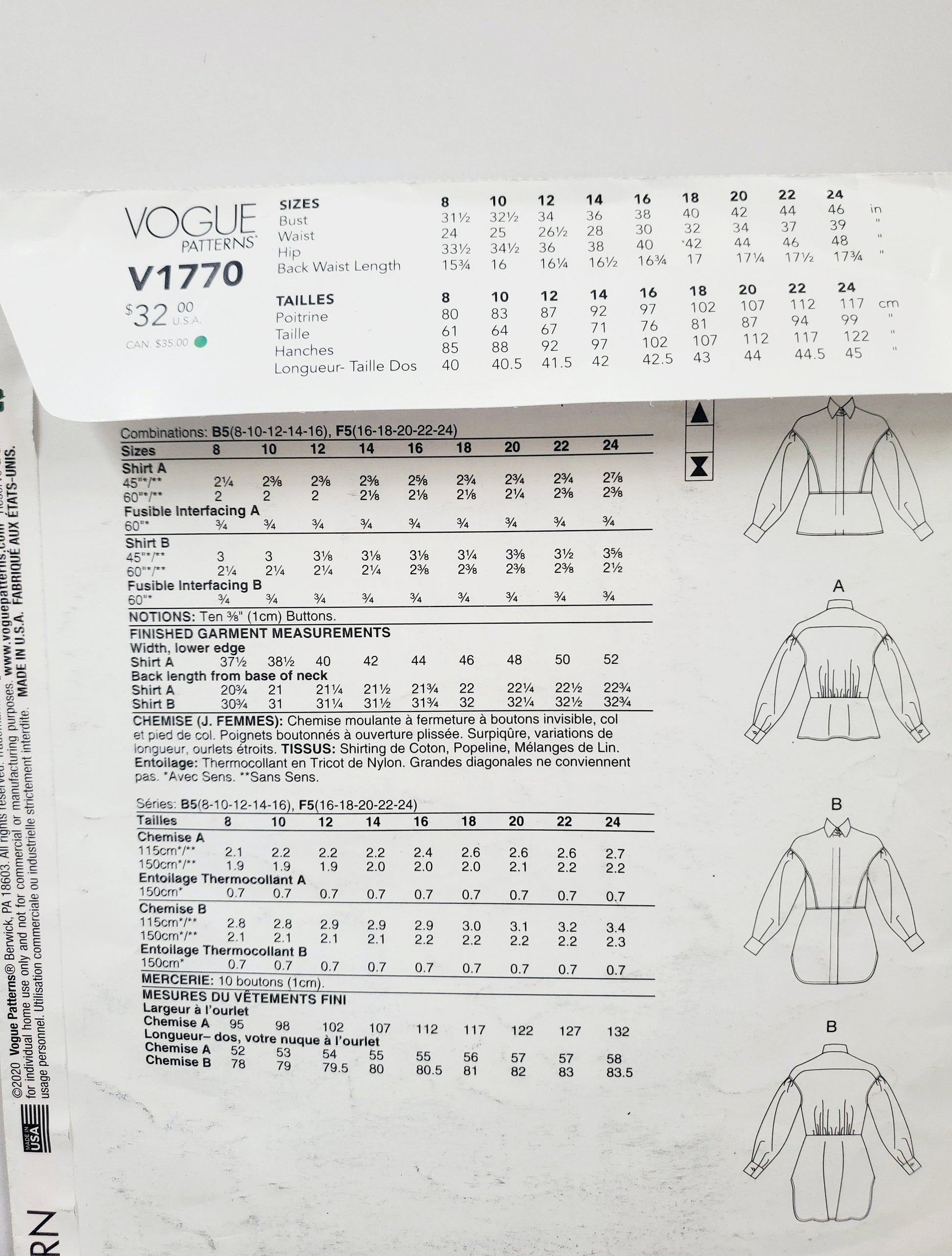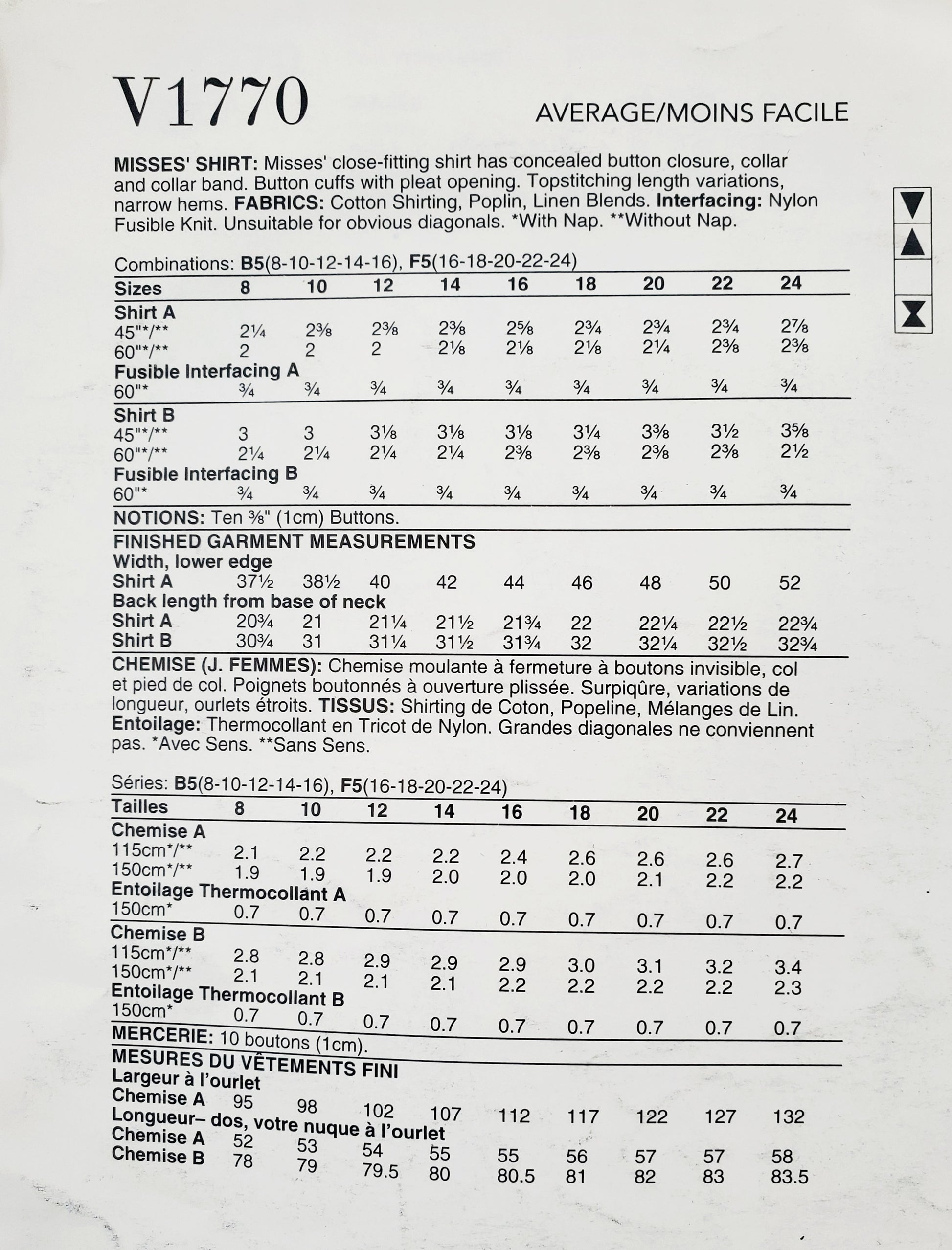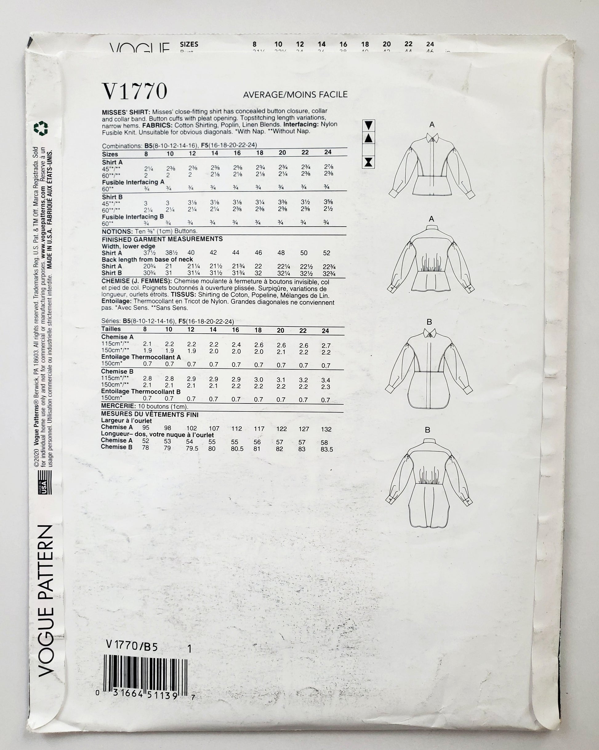 VOGUE PATTERNS, Sewing Pattern V1770, Shirt, Close Fitting Shirt, Length Variations, Size 8-16