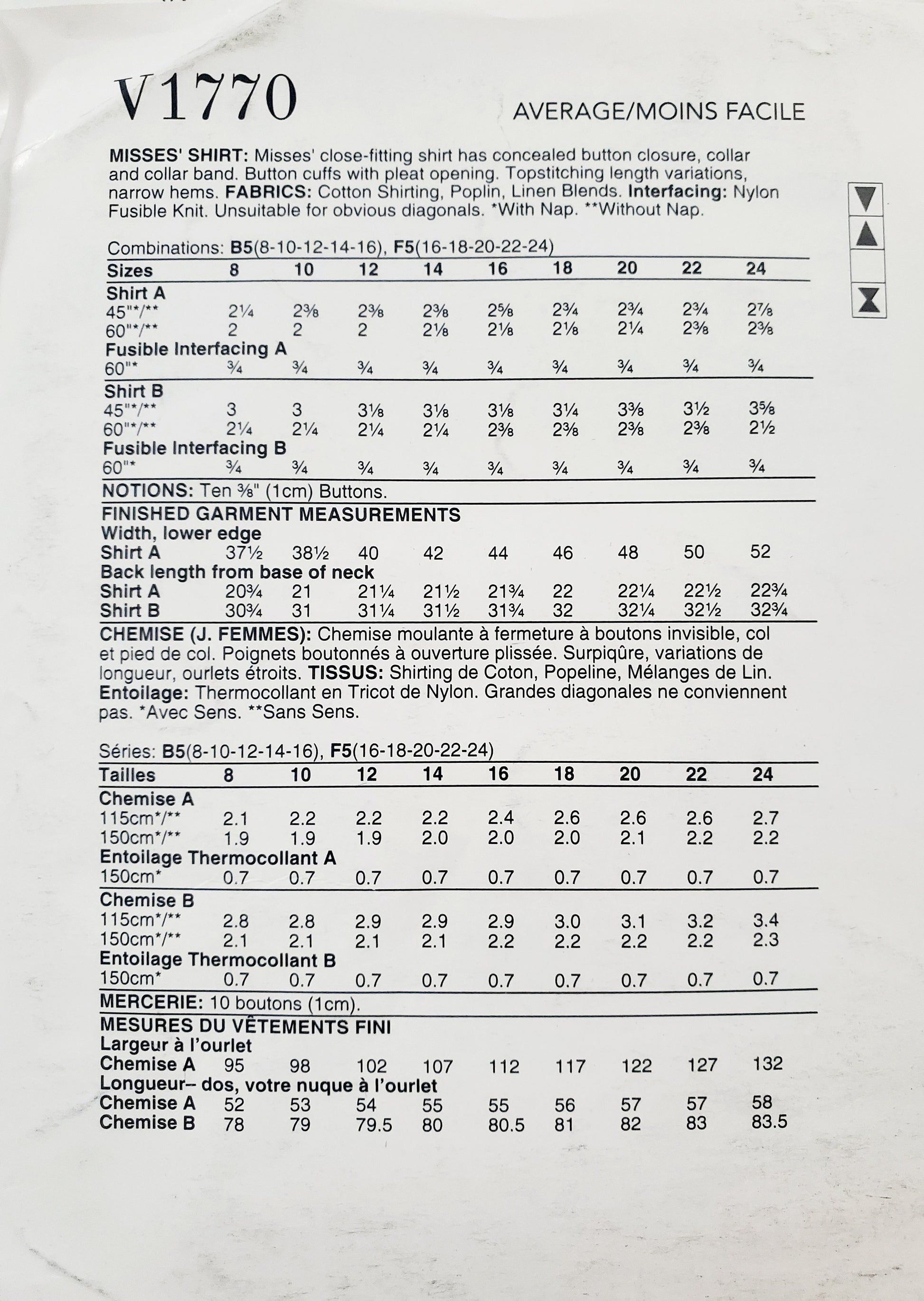 VOGUE PATTERNS, Sewing Pattern V1770, Shirt, Close Fitting Shirt, Length Variations, Size 16-24