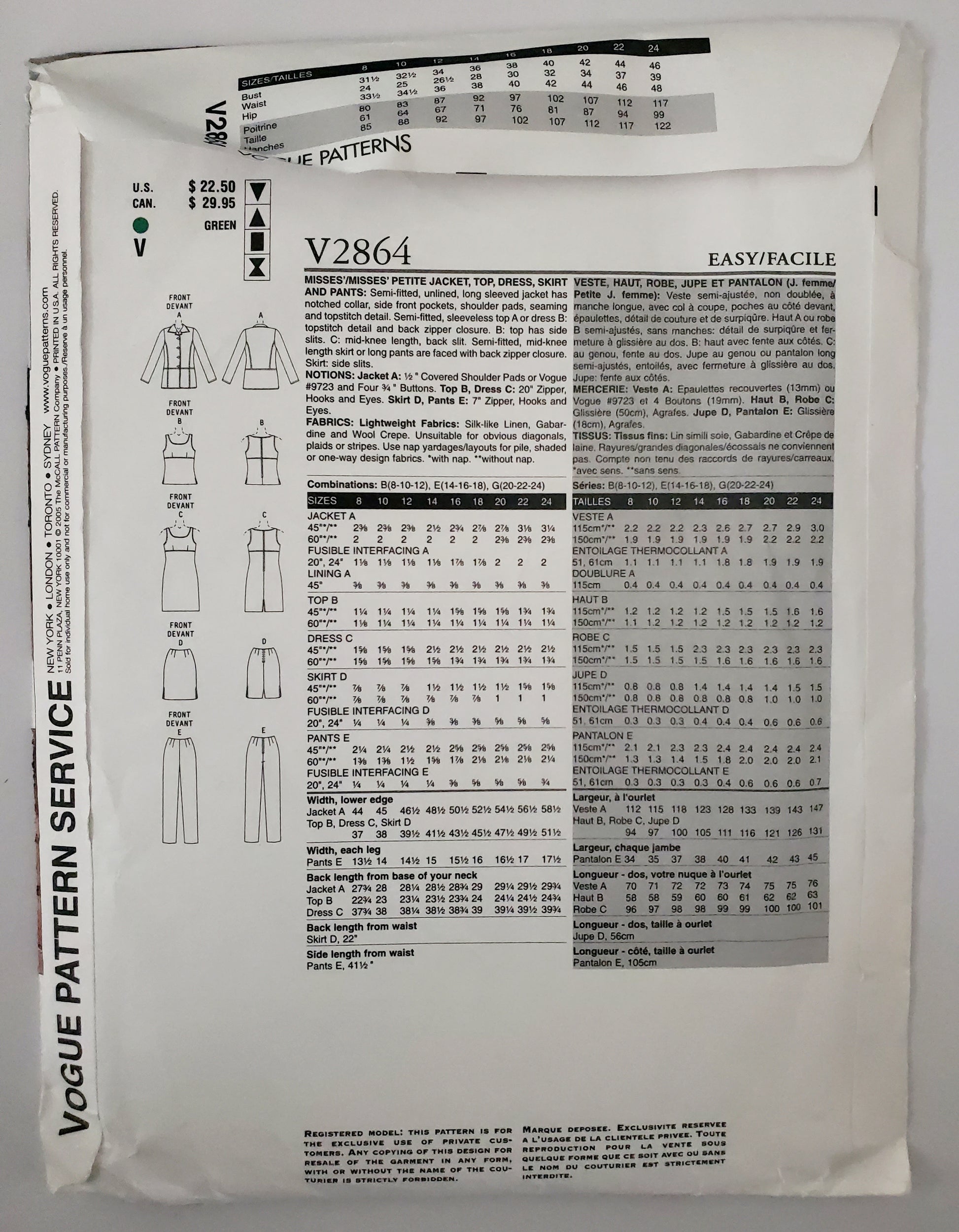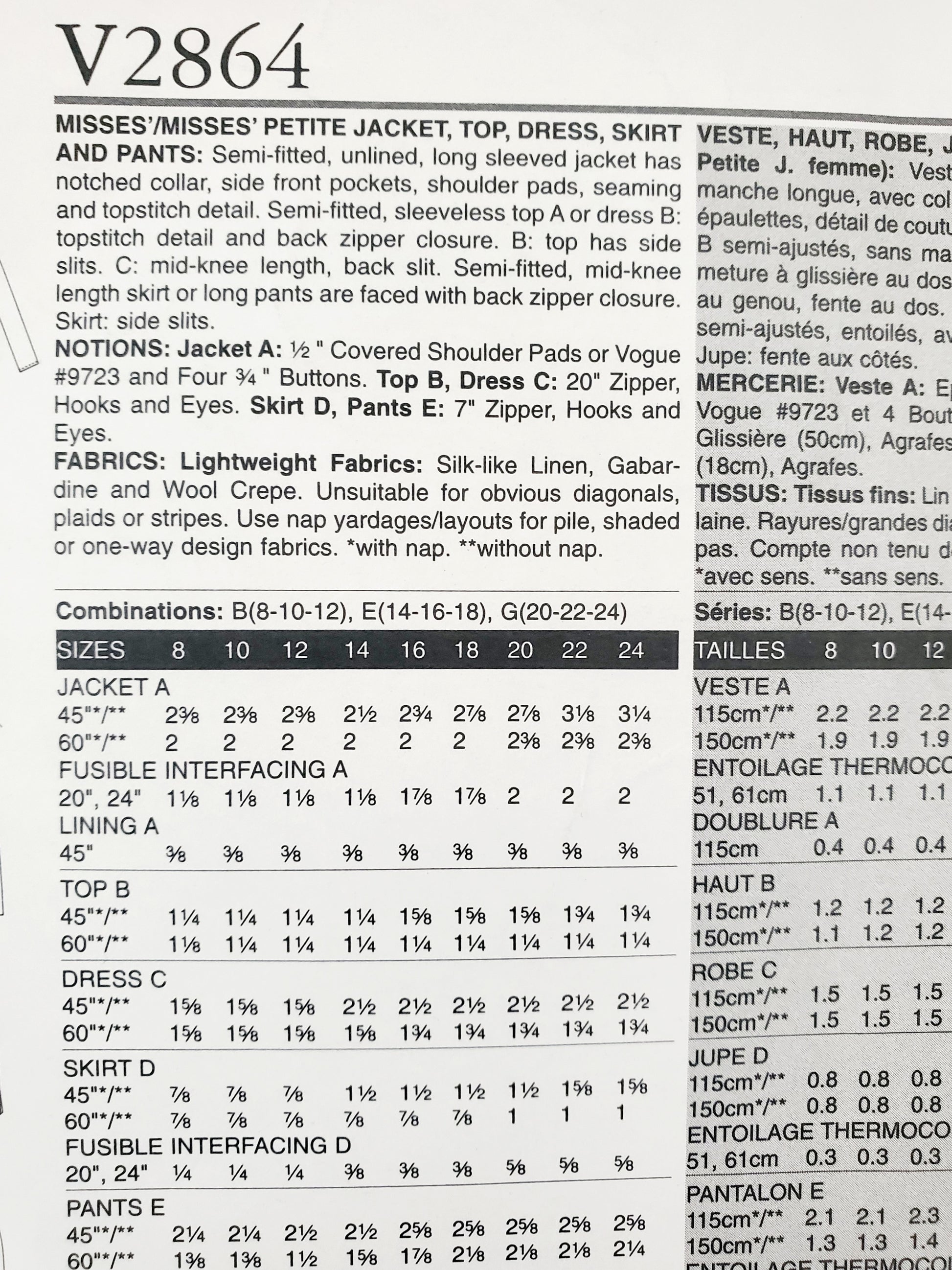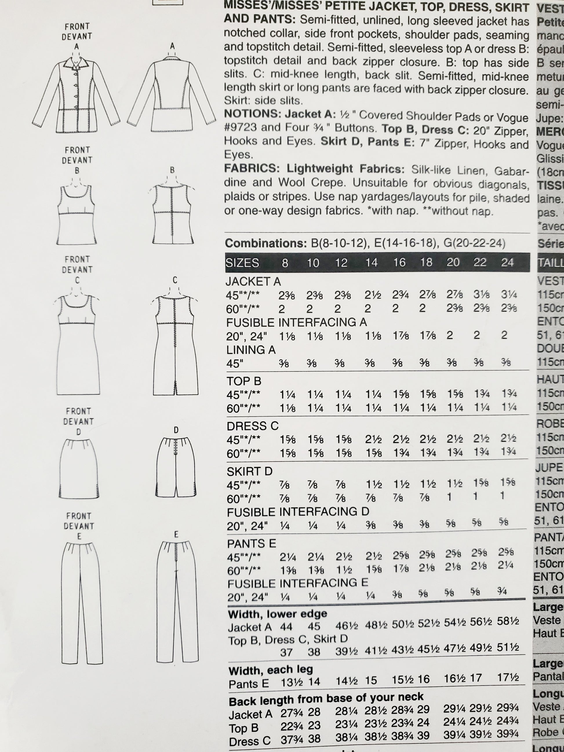 NOTIONS: Jacket A: ½" Covered Shoulder Pads or Vogue #9723 and four ¾" Buttons. Top B, Dress C: 20" Zipper,Hooks and Eyes. Skirt D, Pants E: 7" Zipper,Hooks and Eyes.
