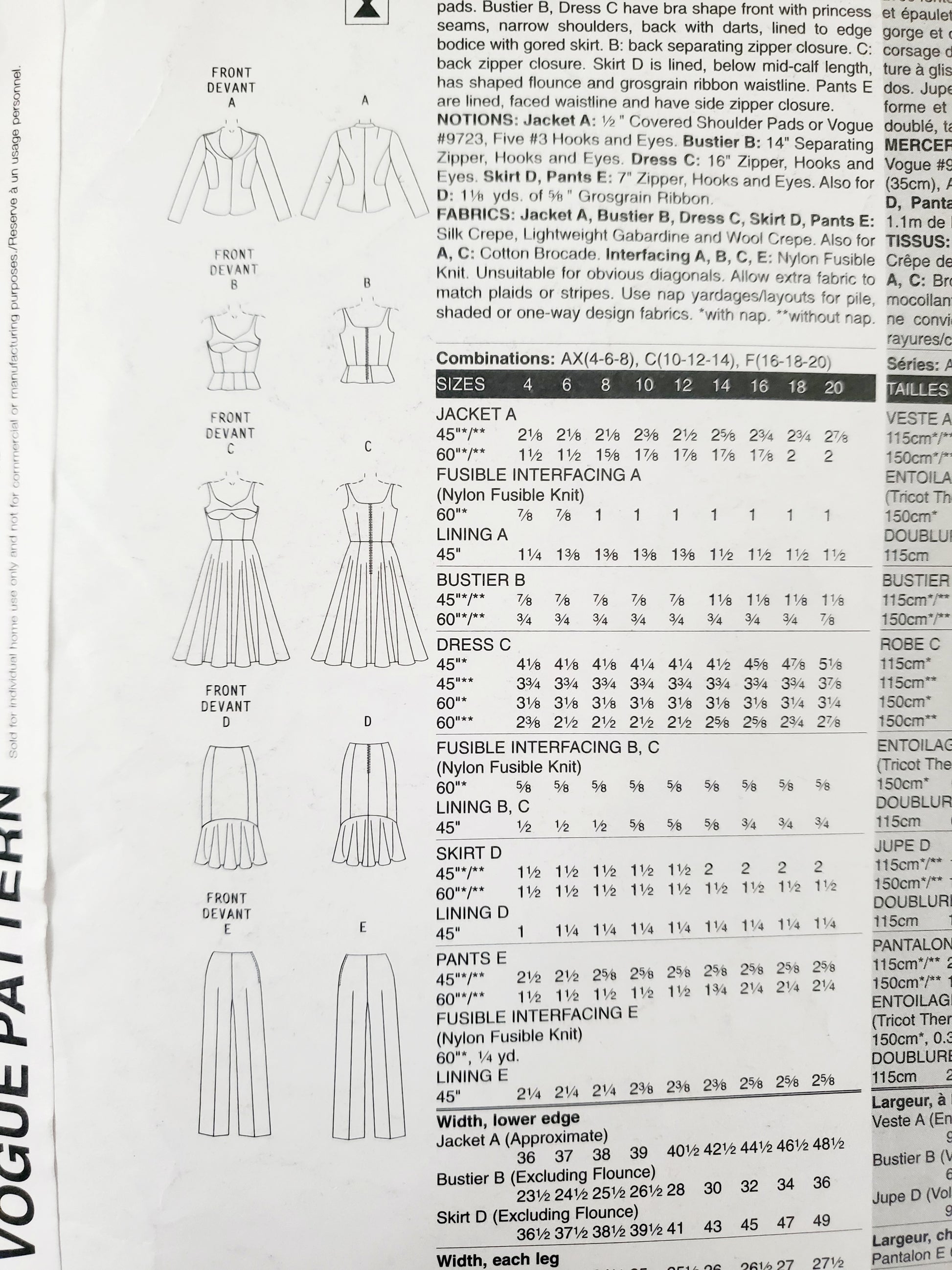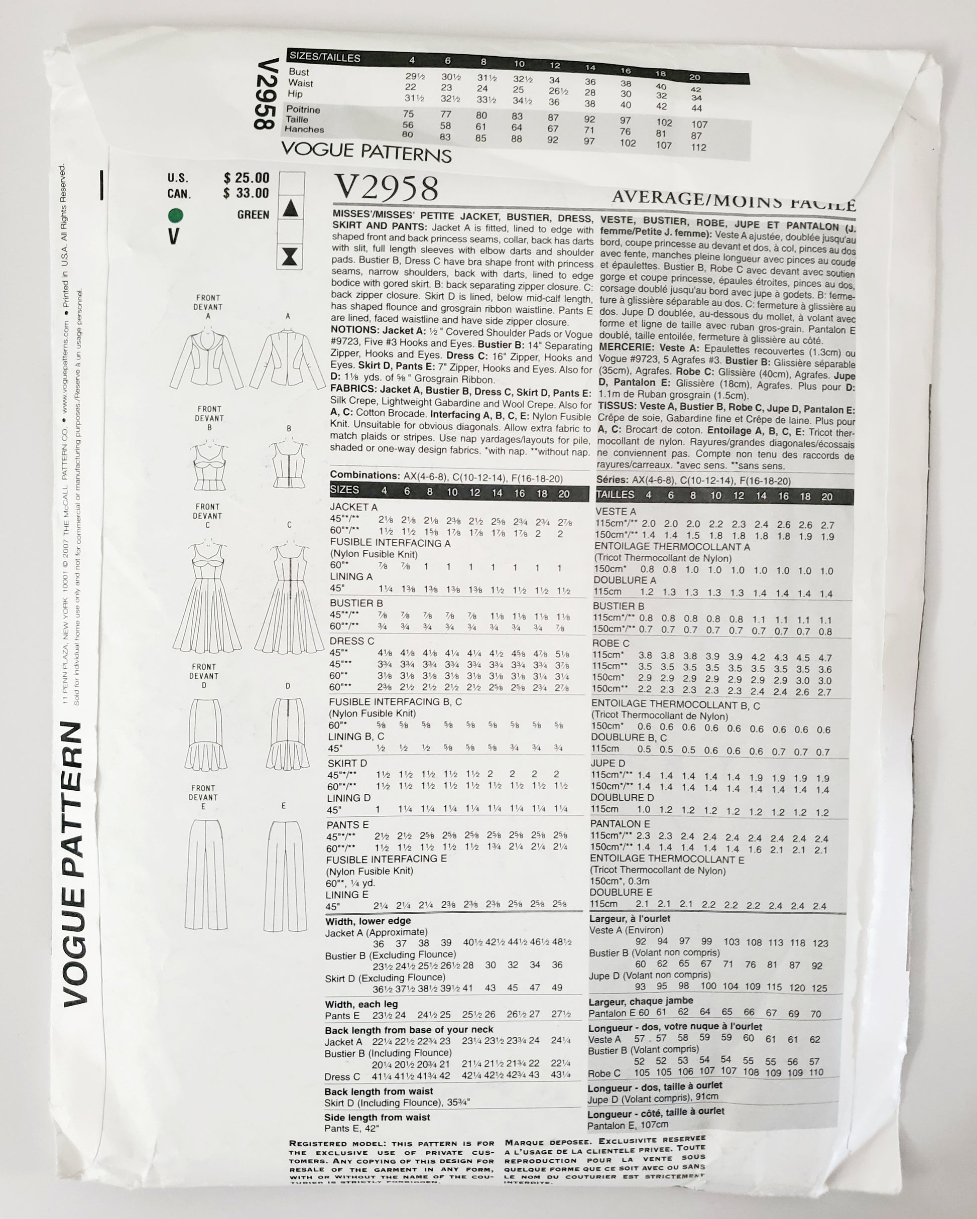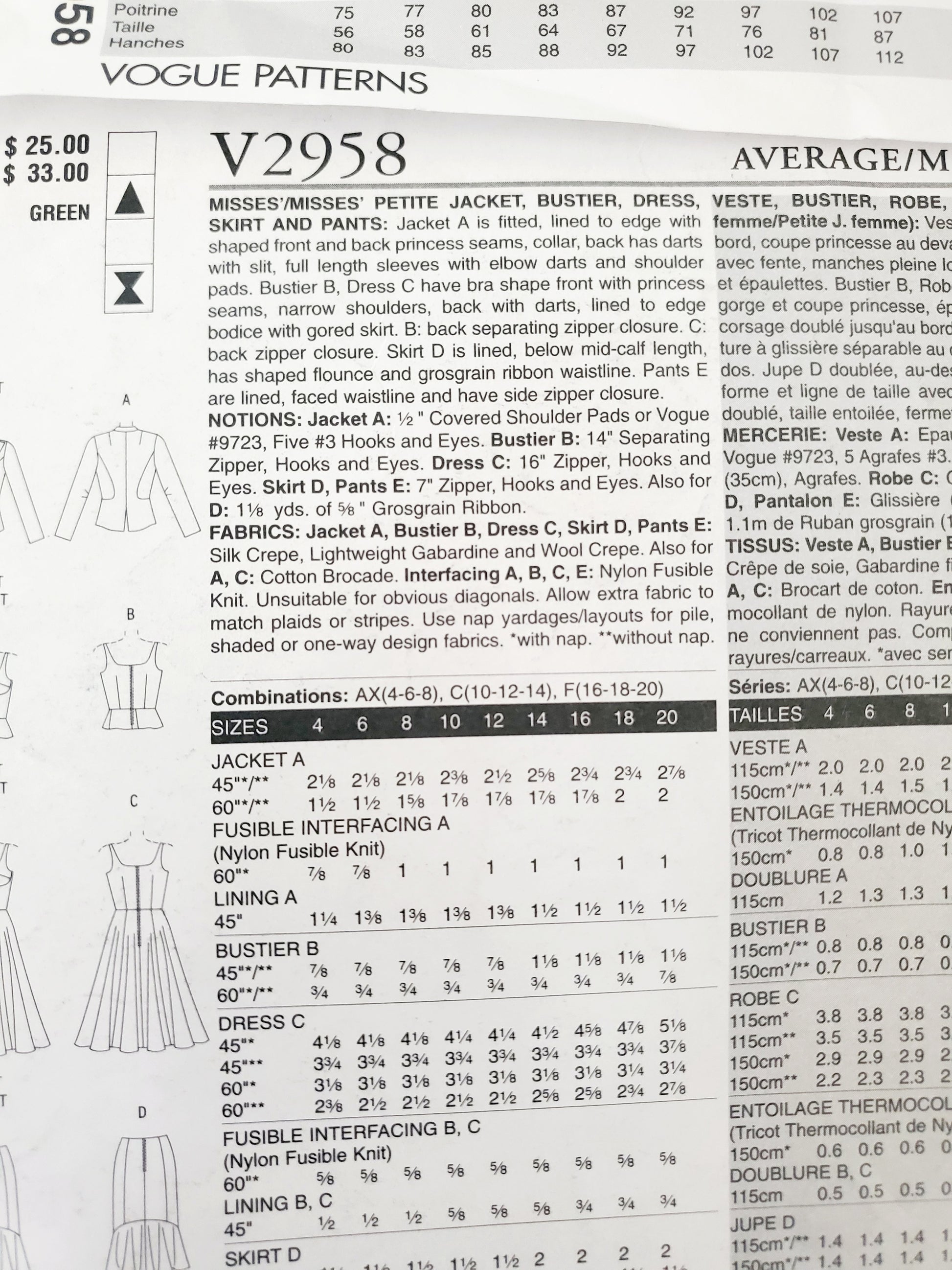 VOGUE PATTERNS, Sewing Pattern V2958, VOGUE WARDROBE, Jacket, Bustier, Dress, Skirt, Pants, Size 10-14