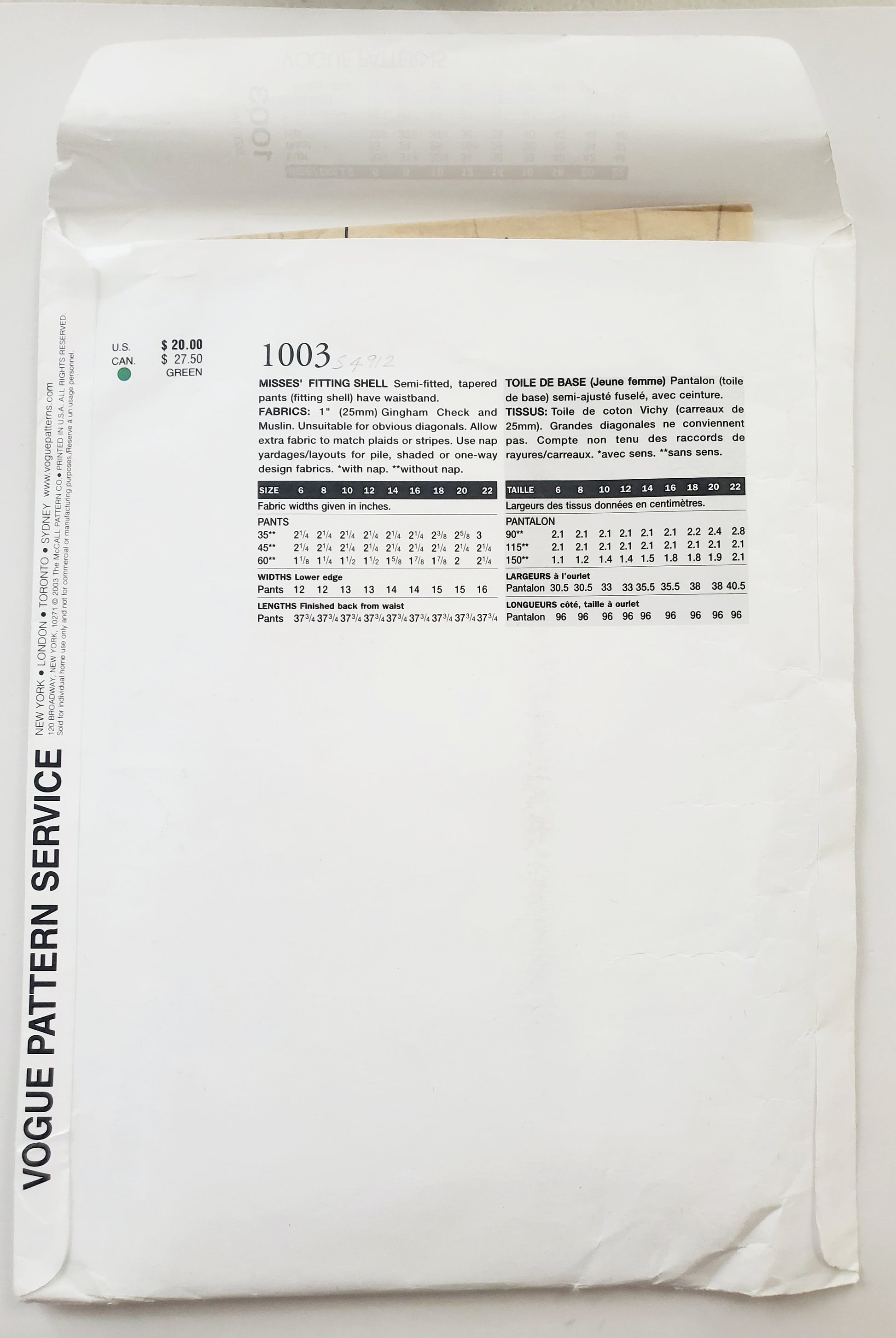 VOGUE Sewing Pattern 1003 Misses Fitting Shell for Tapered Pants Size 8