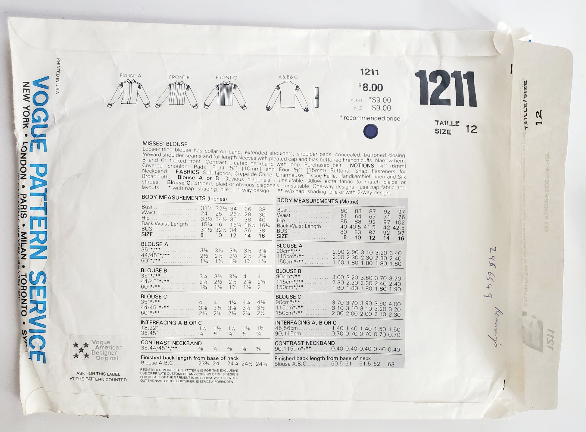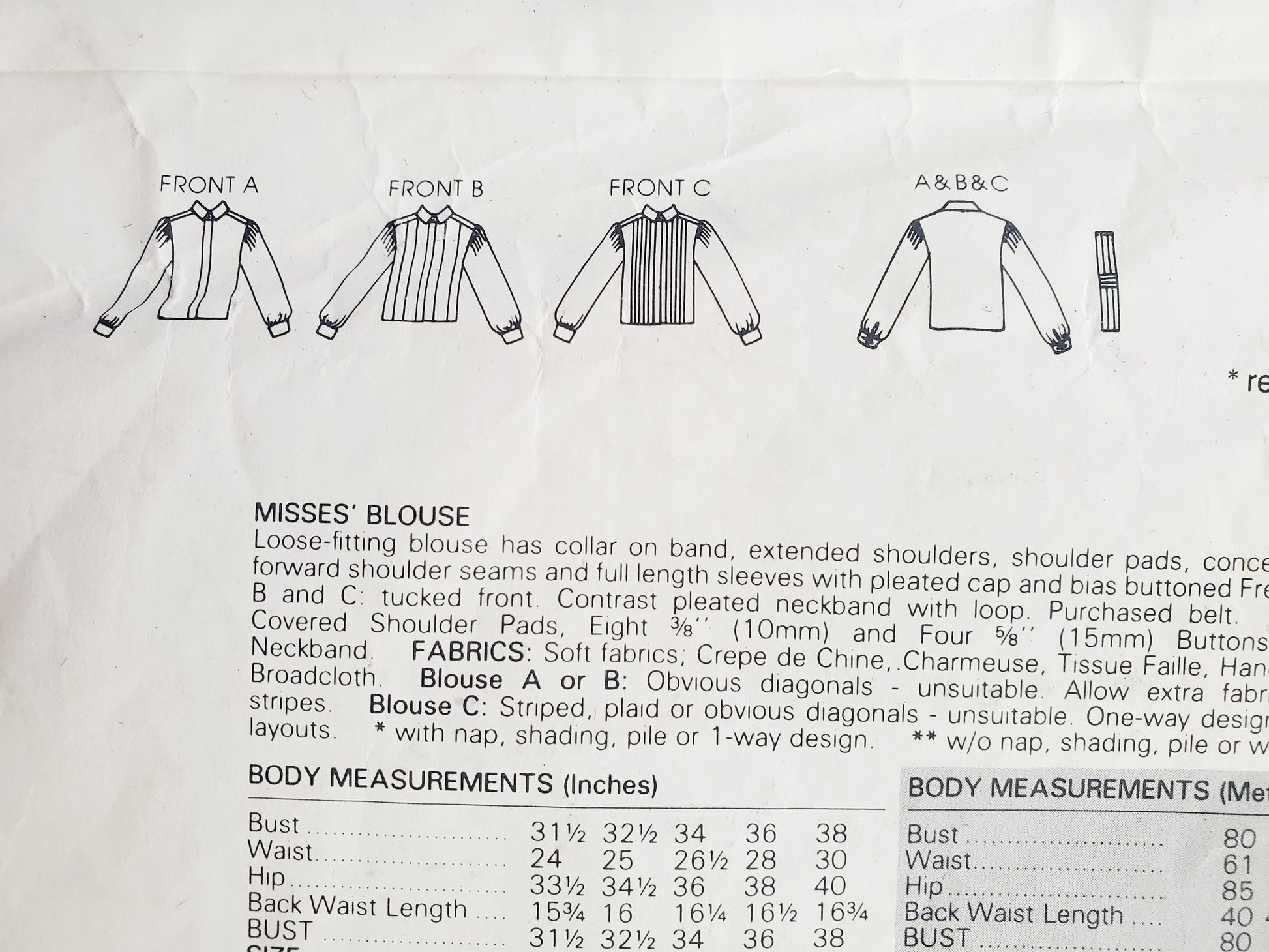 NOTIONS: ¼'' (6mm) Covered Shoulder Pads, Eight ⅜'' (10mm) and Four ⅝'' (15mm) Buttons. Snap Fasteners for Neckband. FABRICS: Soft fabrics; Crepe de Chine, Charmeuse, Tissue Faille, Handkerchief Linen and Silk Broadcloth. Blouse A or B: Obvious diagonals - unsuitable. Allow extra fabric to match plaids or stripes. Blouse C: Striped, plaid or obvious diagonals - unsuitable. One-way designs - use nap fabric and layouts. with nap, shading, pile or 1-way design. * w/o nap, shading, pile or with 2-way design