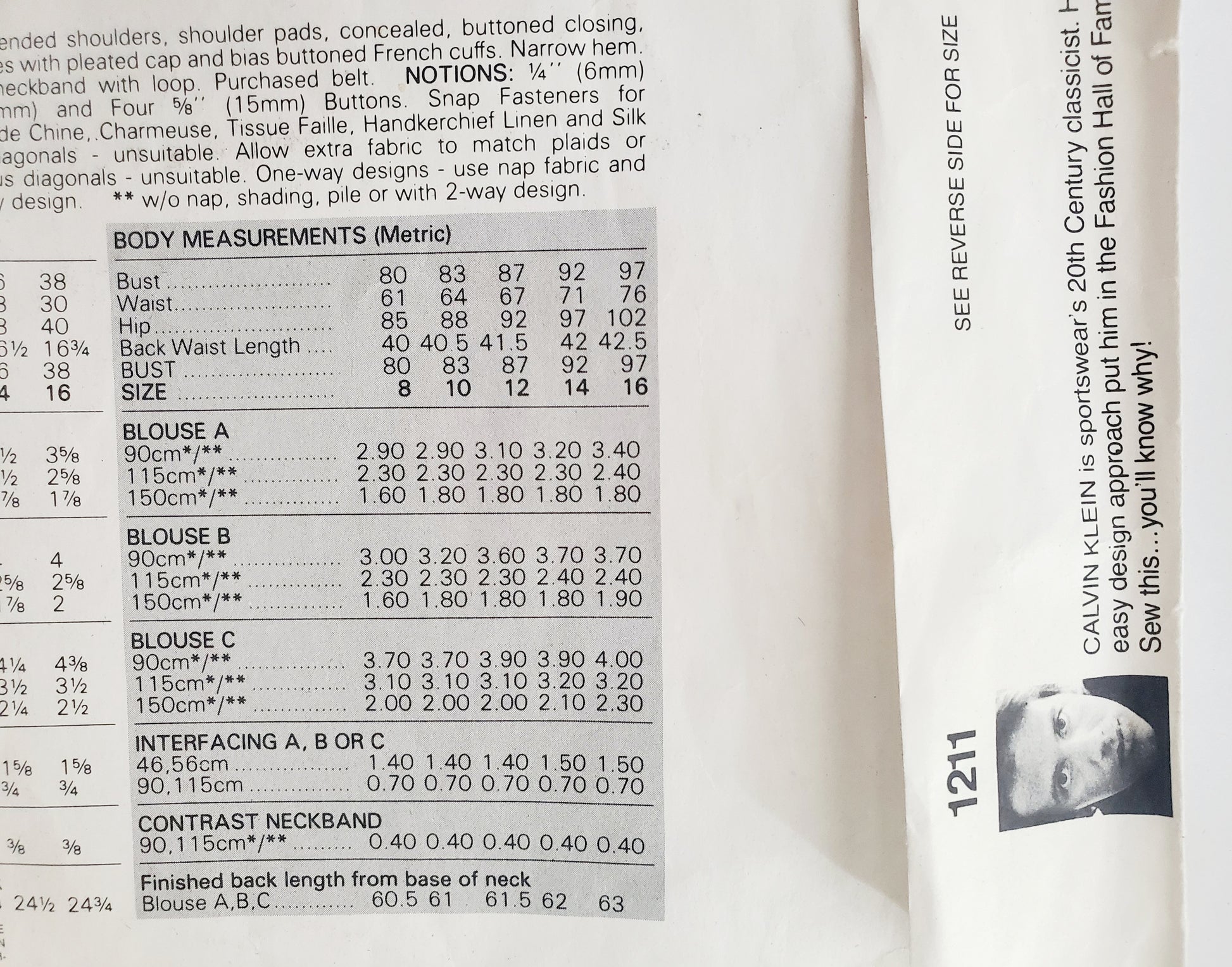 VOGUE Sewing Pattern 1211 CALVIN KLEIN, AMERICAN DESIGNER, Loose Fitting Blouse, Top, Shirt Size 12