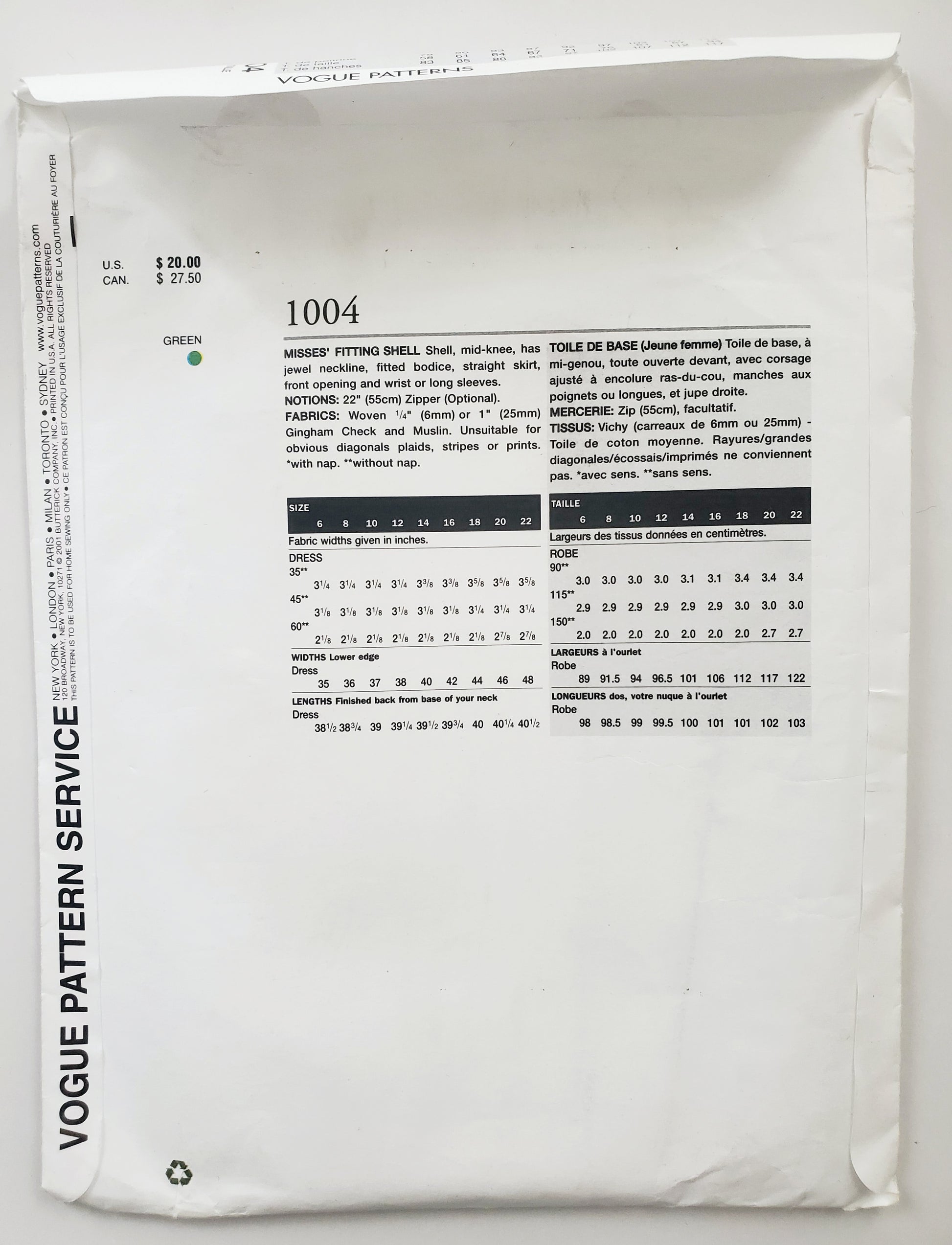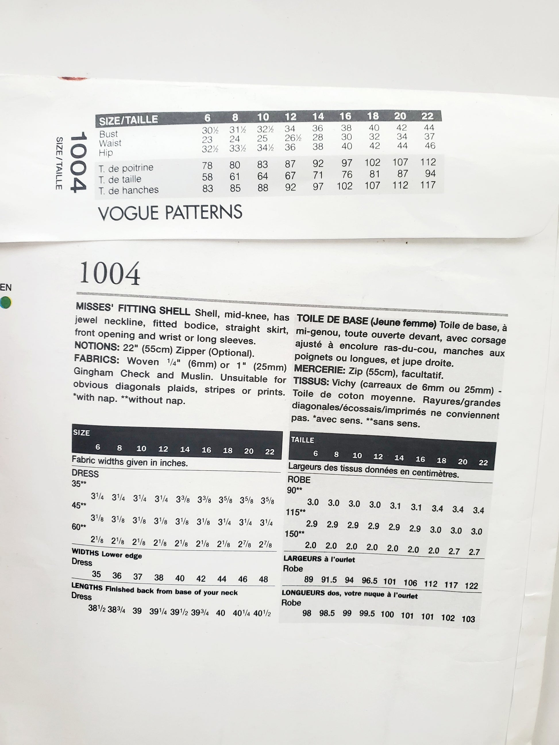 VOGUE Sewing Pattern 1004 Misses Fitting Shell, Dress & Skirt Size 6