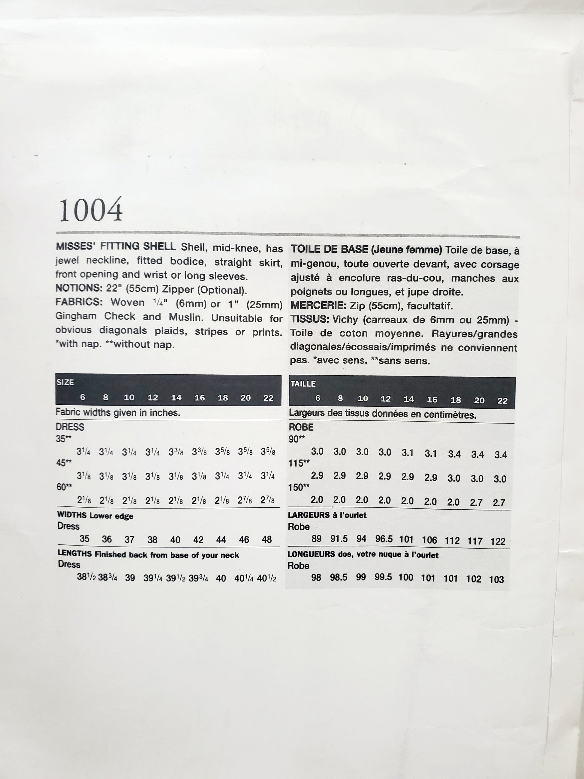 1004 MISSES' FITTING SHELL Shell, mid-knee, has jewel neckline, fitted bodice, straight skirt, front opening and wrist or long sleeves.