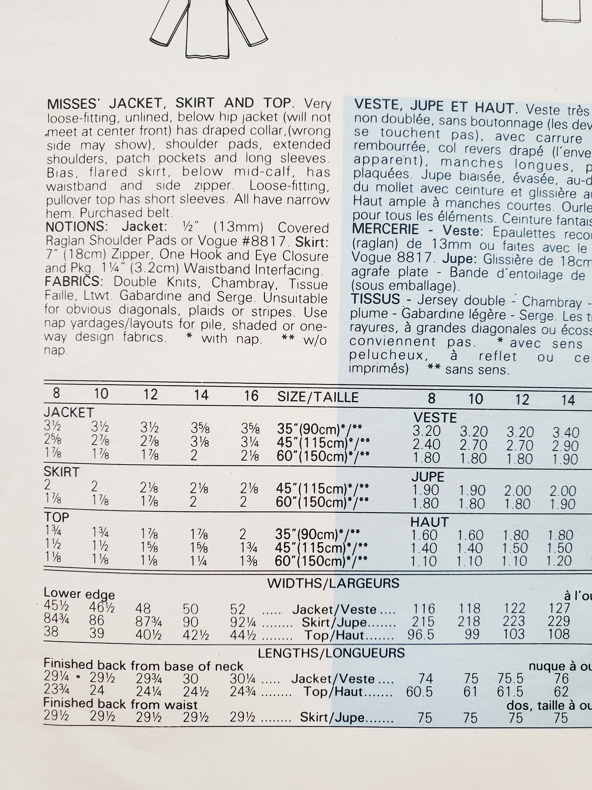 NOTIONS: Jacket: ½" (13mm) Covered Raglan Shoulder Pads or Vogue #8817. Skirt: 7" (18cm) Zipper, One Hook and Eye Closure and Pkg. 1¼" (3.2cm) Waistband Interfacing.