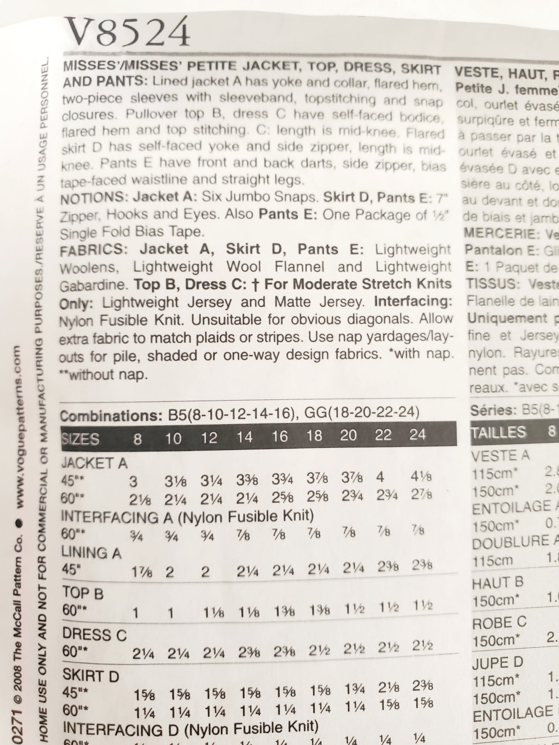 FABRICS: Jacket A, Skirt D, Pants E: Lightweight Woolens, Lightweight Wool Flannel and Tweeds. Top B, Dress C: † For Moderate Stretch Knits Only: Lightweight Jersey and Matte Jersey. Additional Note: Nylon Fusible Knit. Unsuitable for obvious diagonals. Allow extra fabric to match plaids or stripes. Use nap yardages/layouts for pile, shaded or one-way design fabrics. *With nap. **Without nap.