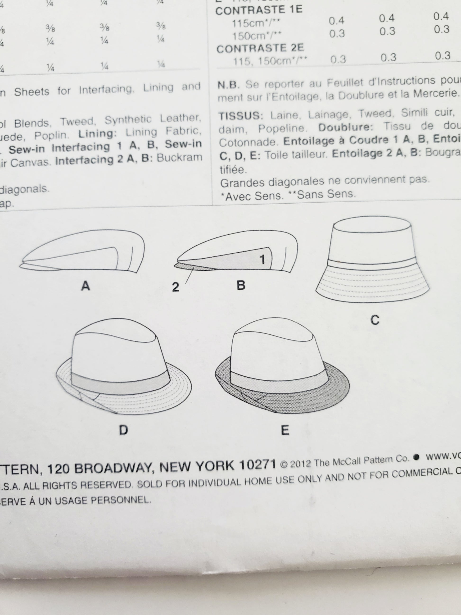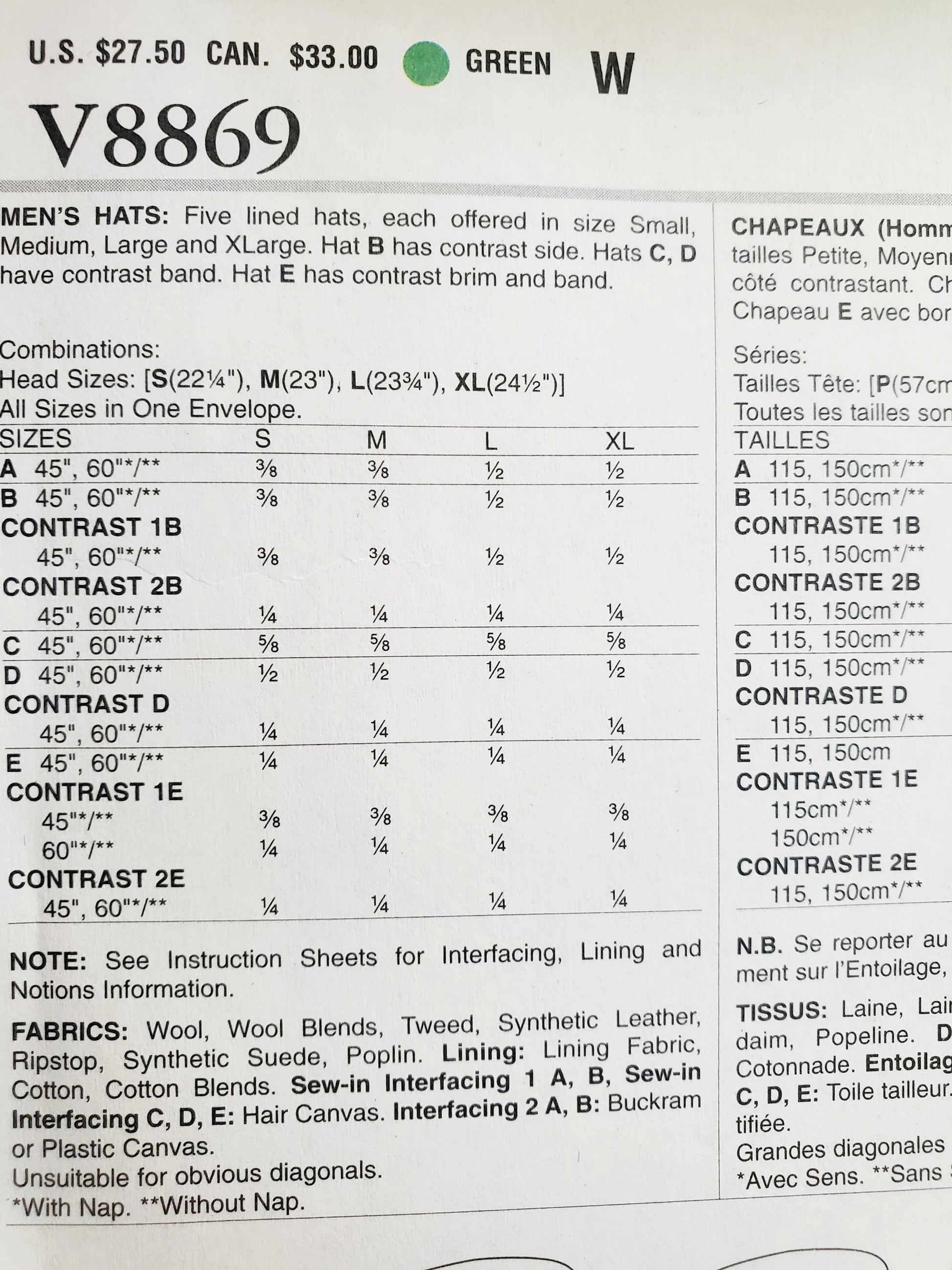VOGUE Sewing Pattern V8869, Men's Hats, Lined Hats, All Sizes, Vogue Accessories