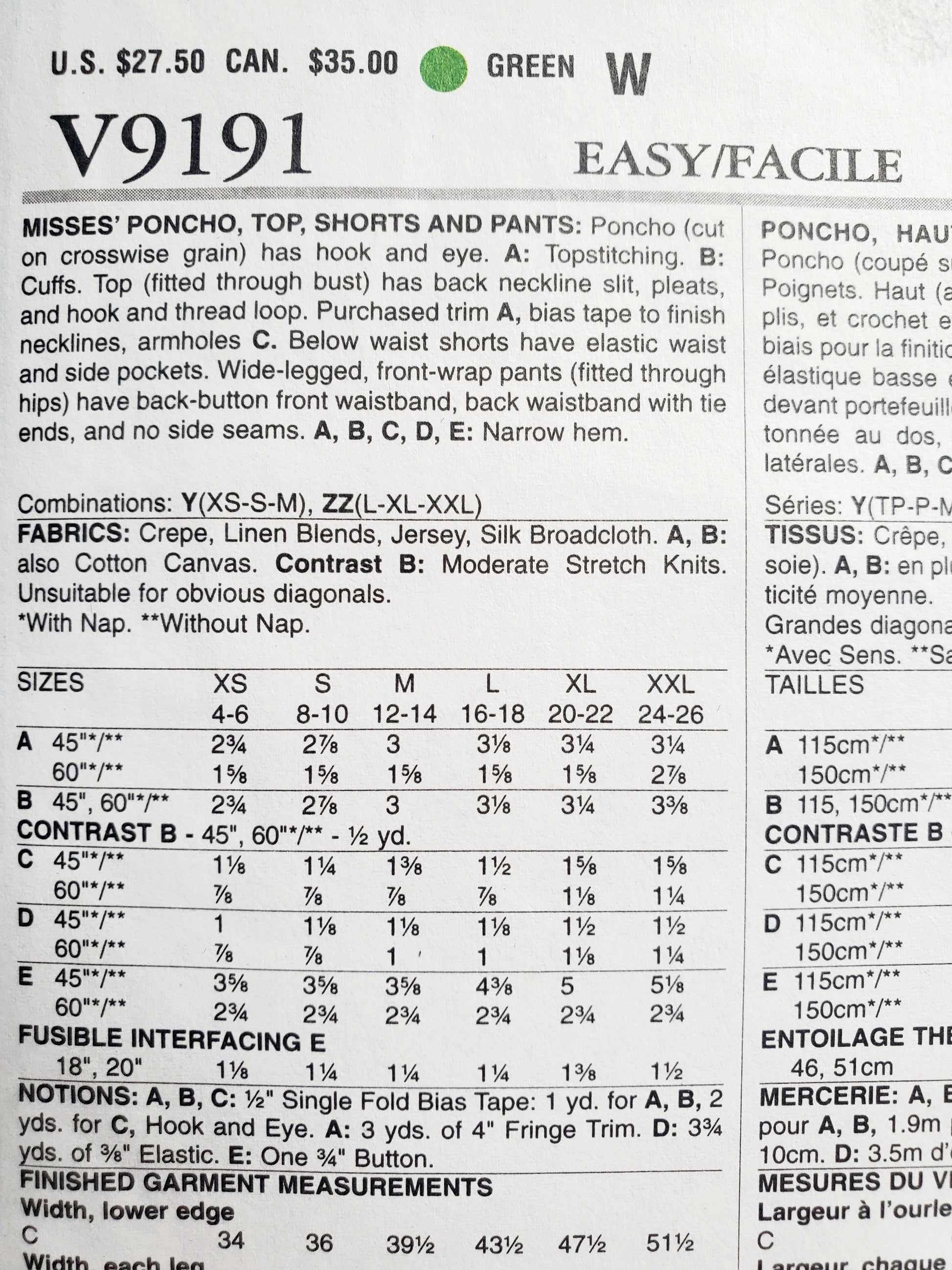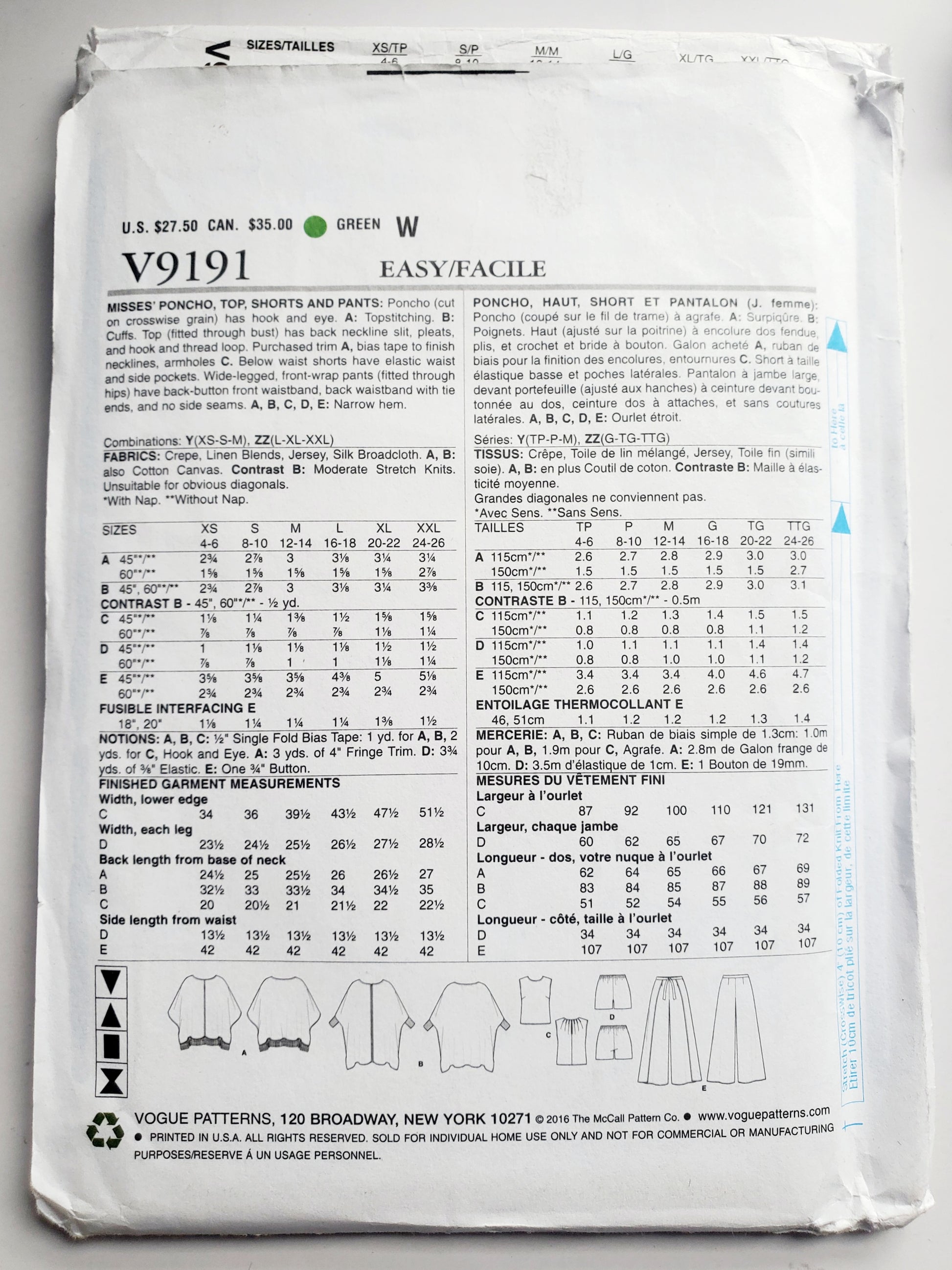 MISSES' PONCHO, TOP, SHORTS AND PANTS: Poncho A: cut on crosswise grain with hook and eye closing. Top B: topstitching, cuffs, back neckline slit, pleats, hook and thread loop, purchased trim, bias tape for neckline and armholes. Shorts C: elastic waist and side pockets. Pants D: wide-legged, front-wrap with back-button front waistband, back waistband with tie ends, no side seams. E: narrow hem.