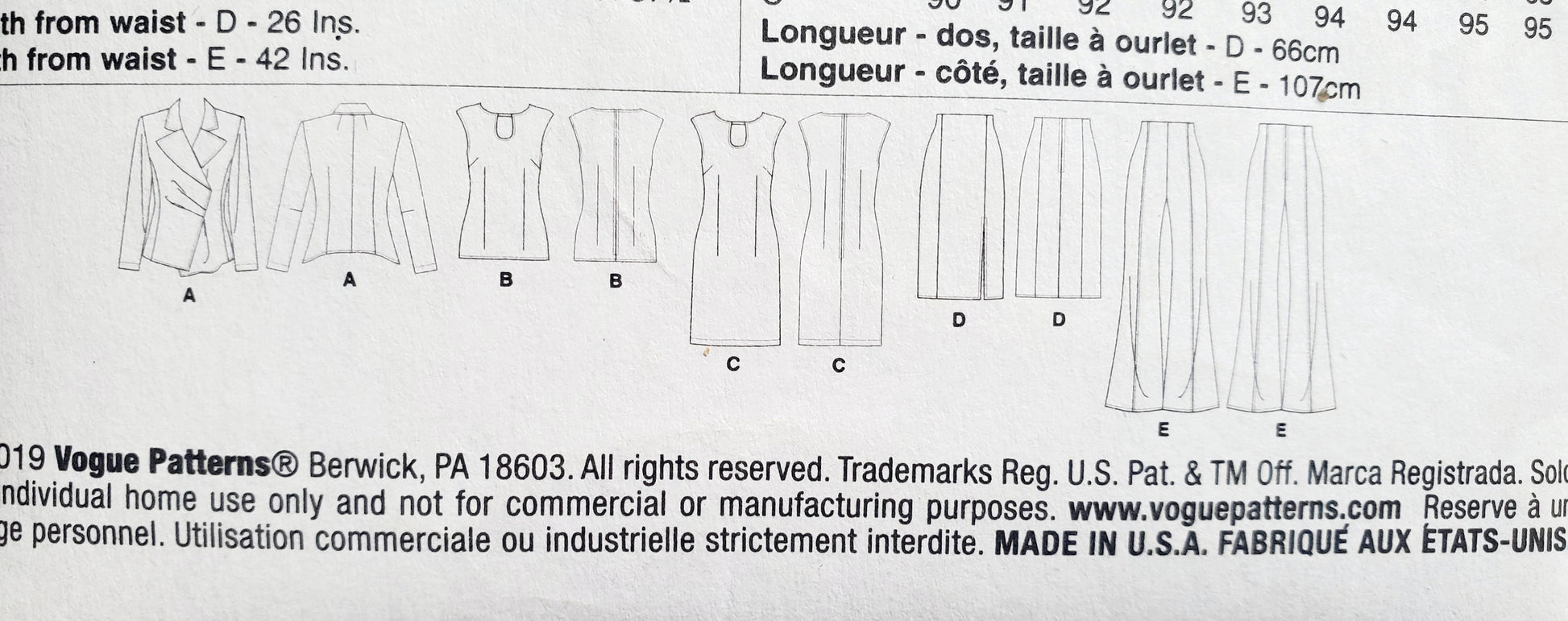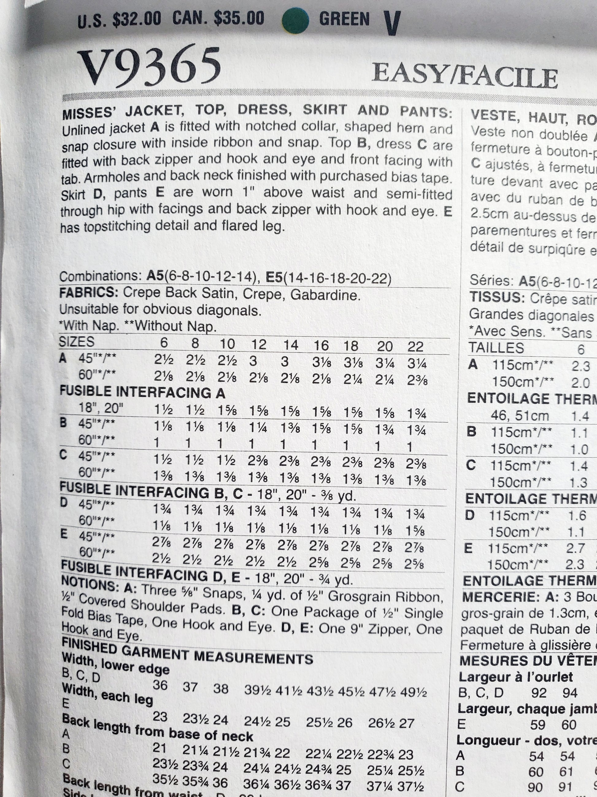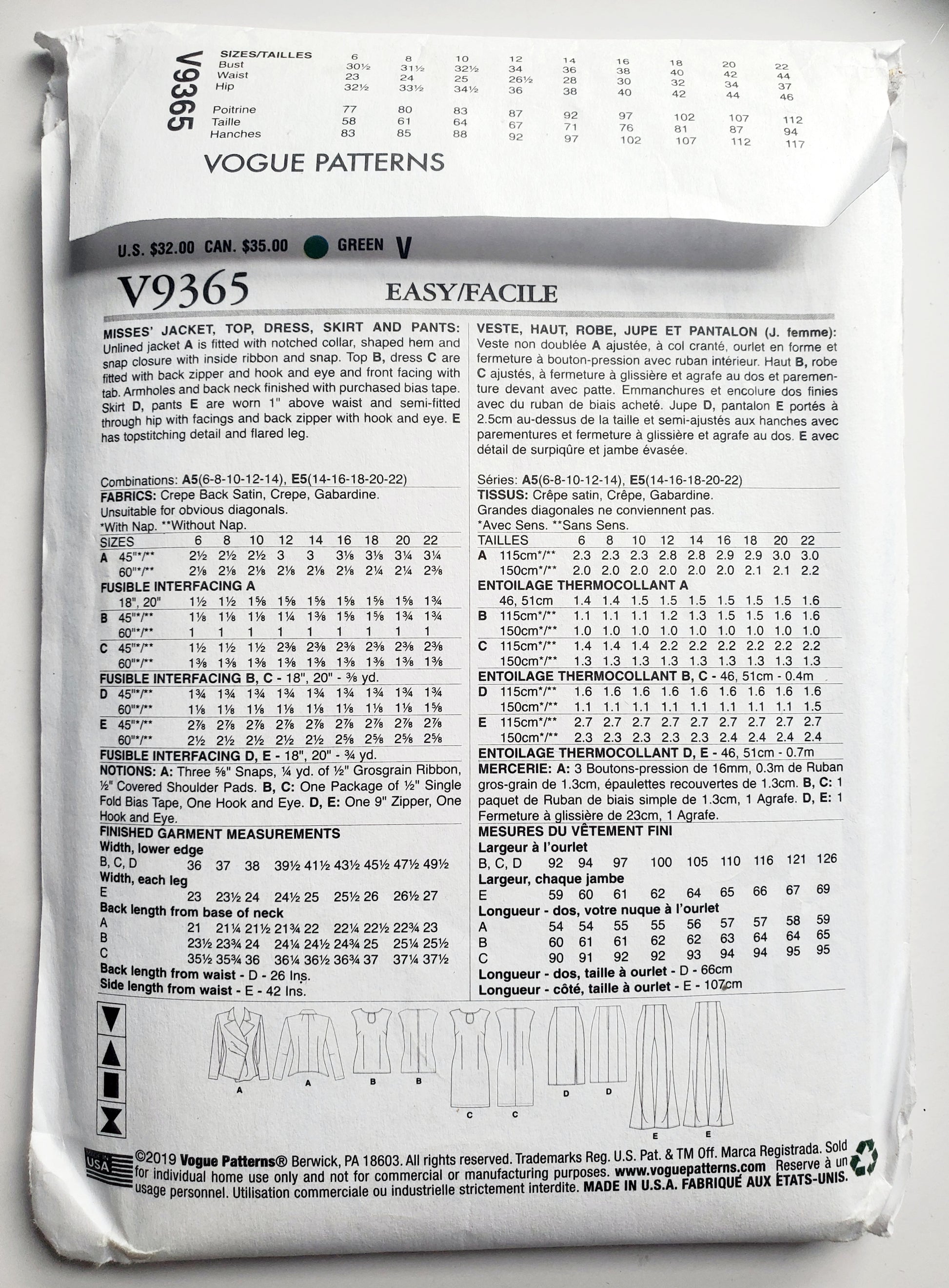 VOGUE Sewing Pattern V9365, Vogue Wardrobe, Jacket, Top, Dress, Skirt, Pants, Size 6-14